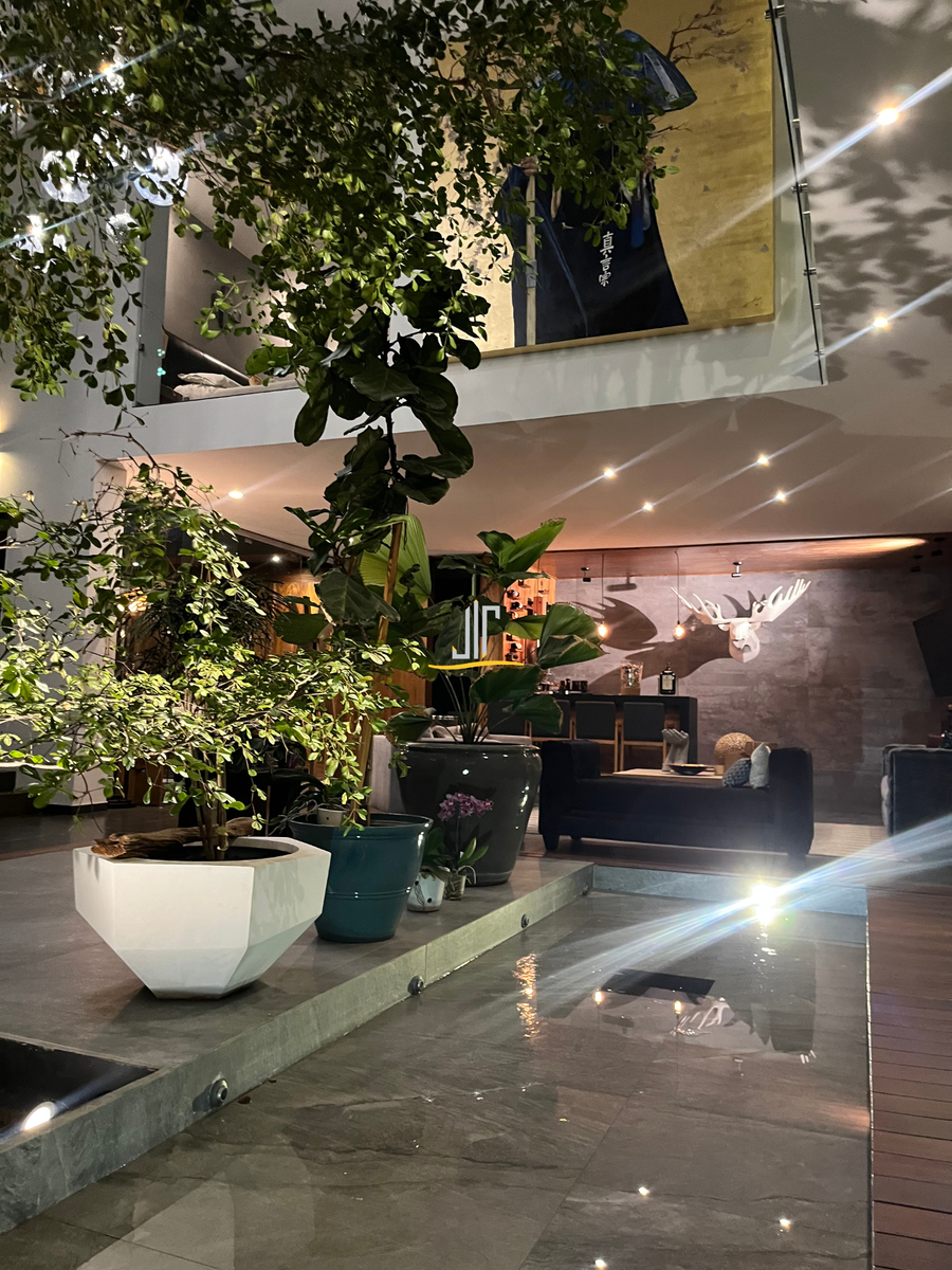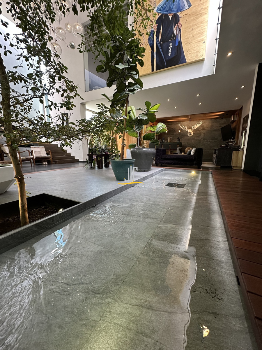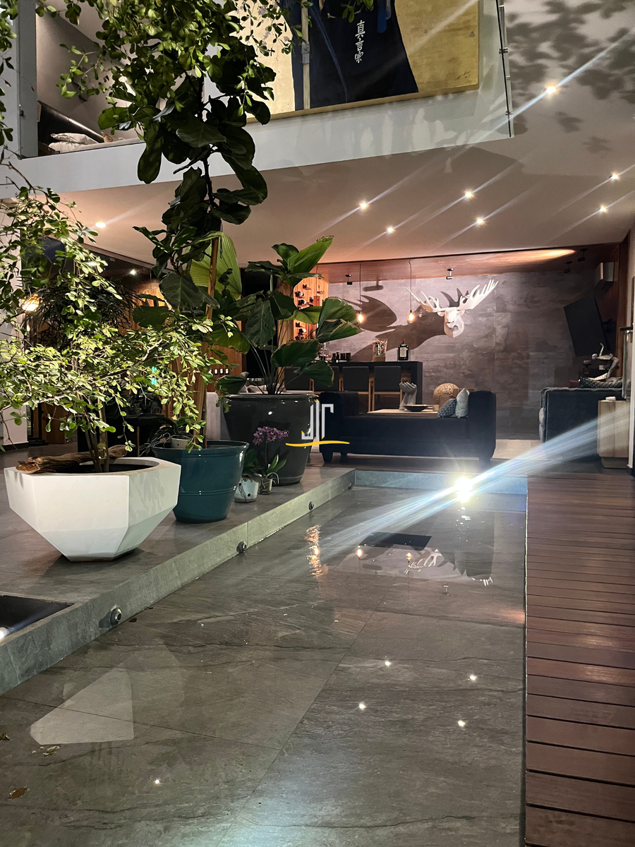 Un espejo de agua central, flanqueado por revestimientos en madera española natural y porcelanato italiano, se convierte en el eje visual y emocional de la casa.