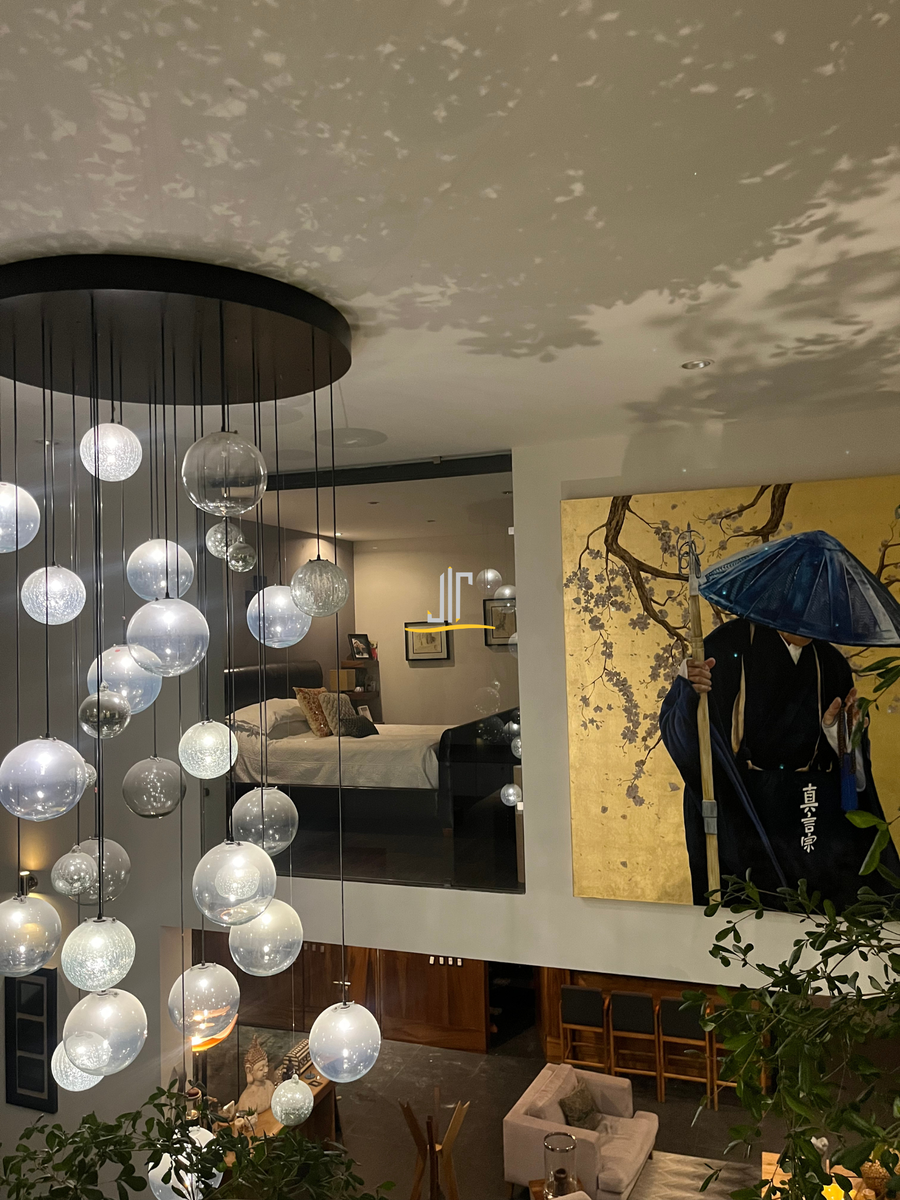 Se accede mediante una escalera escultural que acompaña visualmente la doble altura.