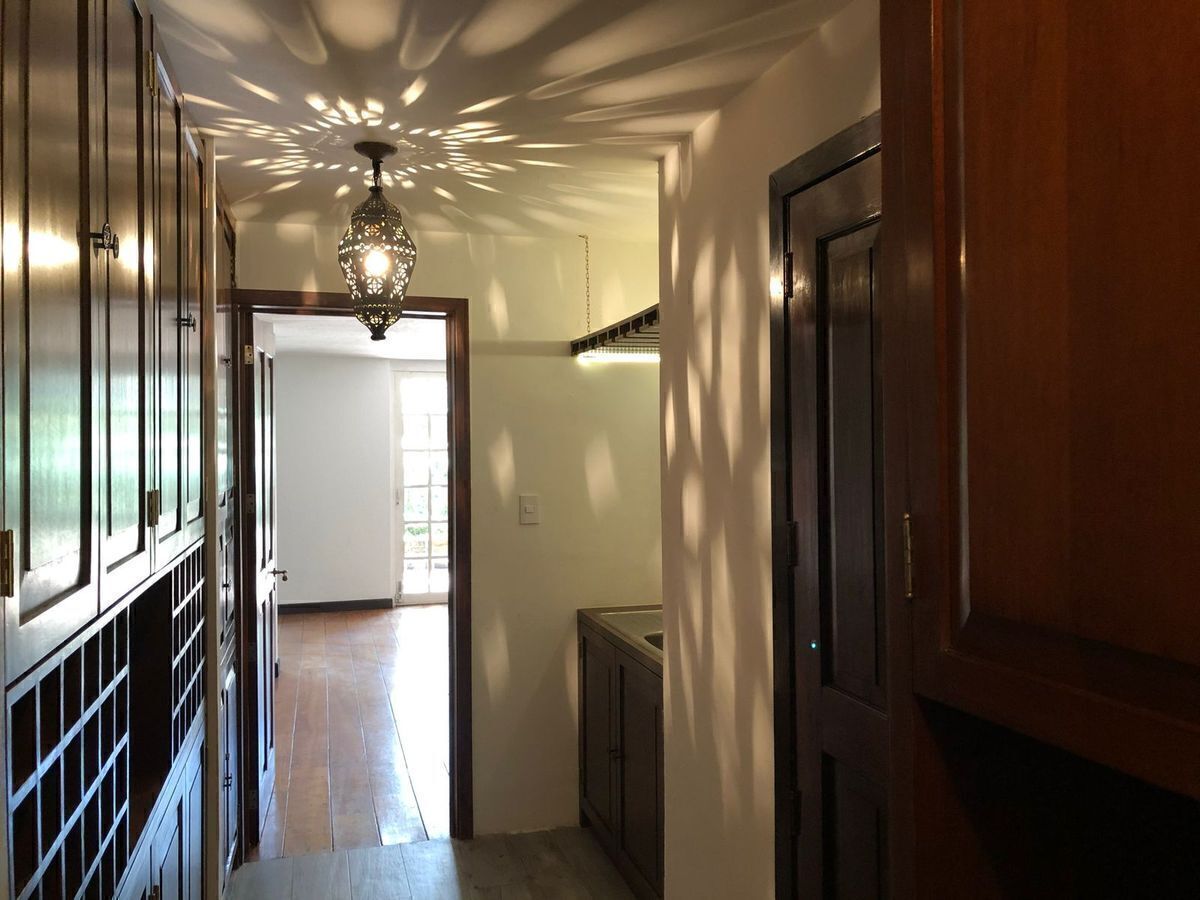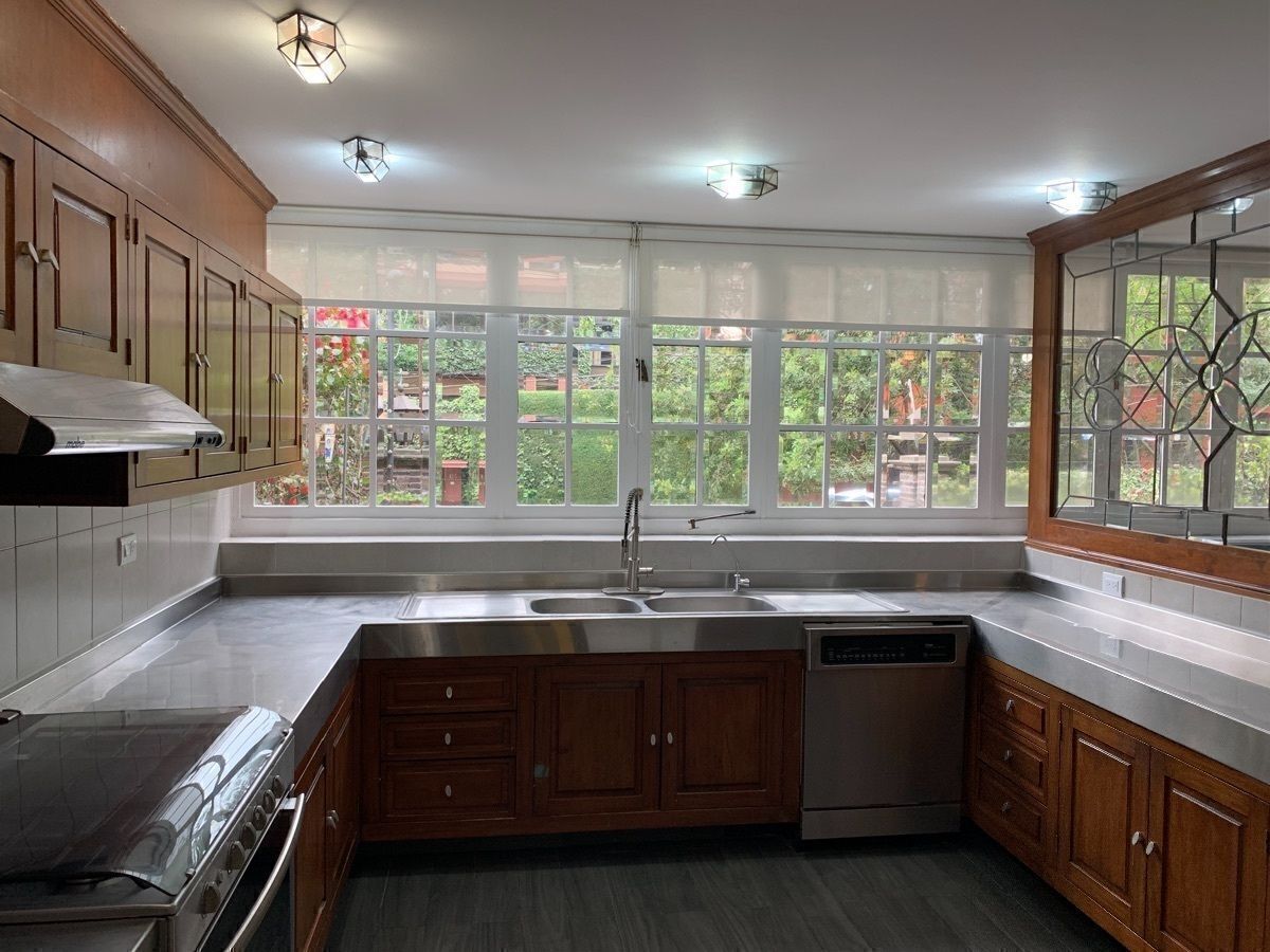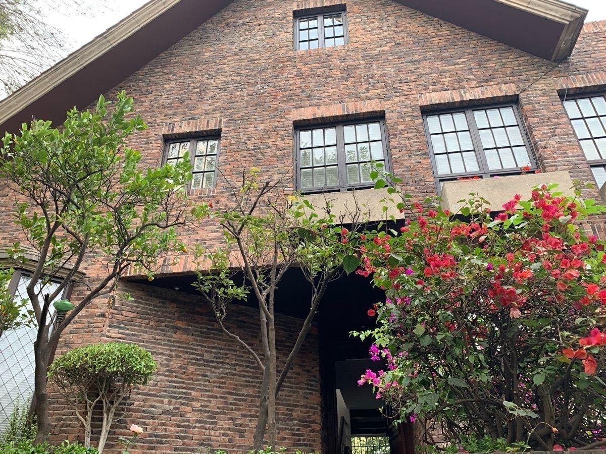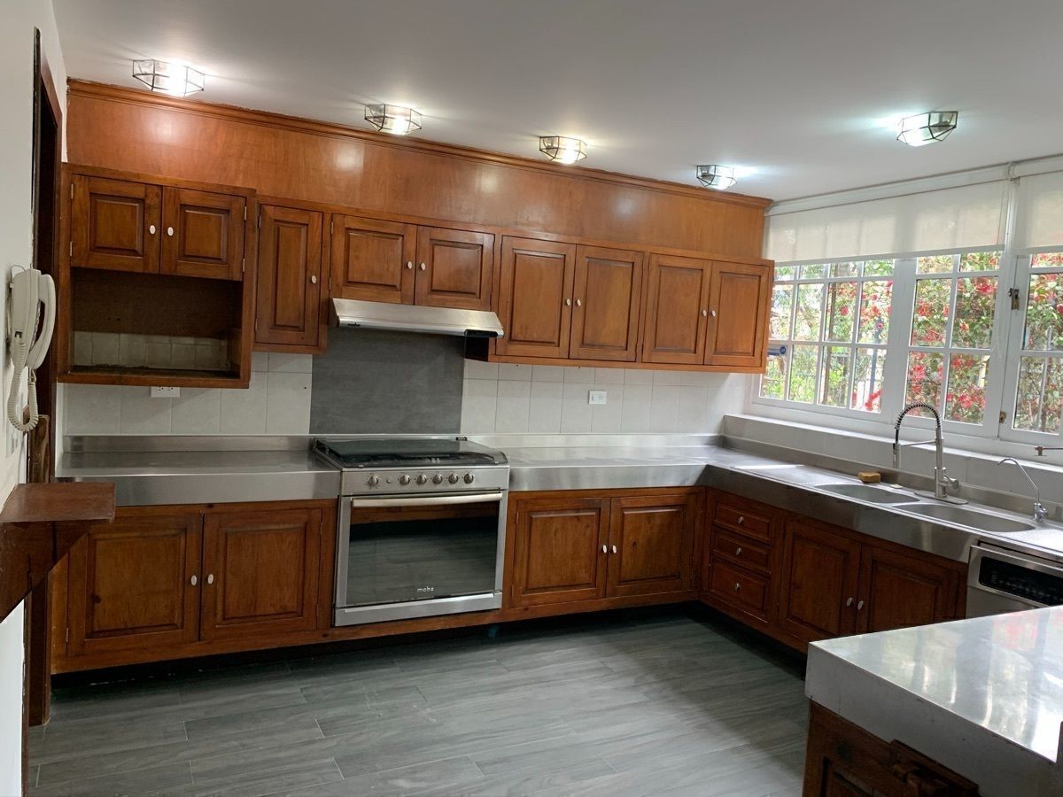 This impeccable residence welcomes you with beautiful wooden floors and high mahogany wood ceilings in the living room with a brick fireplace and large windows that provide incredible brightness.