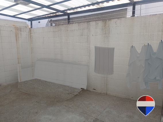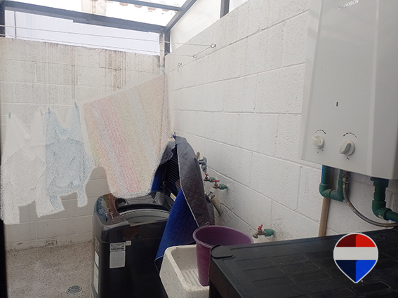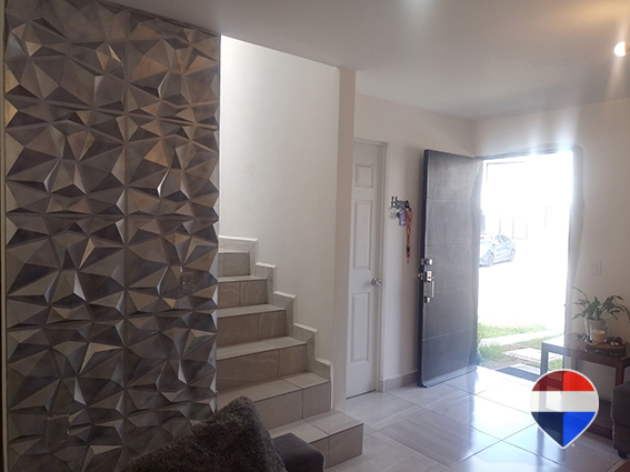 En planta baja: sala, comedor, cocina integral abierta, patio trasero con área de lavado techada. Un medio baño.