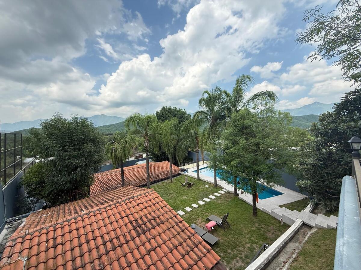 La casa principal tiene 2 recámaras con aire acondicionado, sala climatizada y 3 baños completos. La cochera tiene capacidad para 7 autos, además de un invernadero y en planta alta una bodega adicional.
