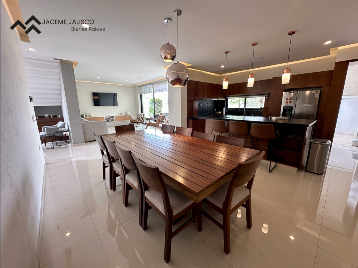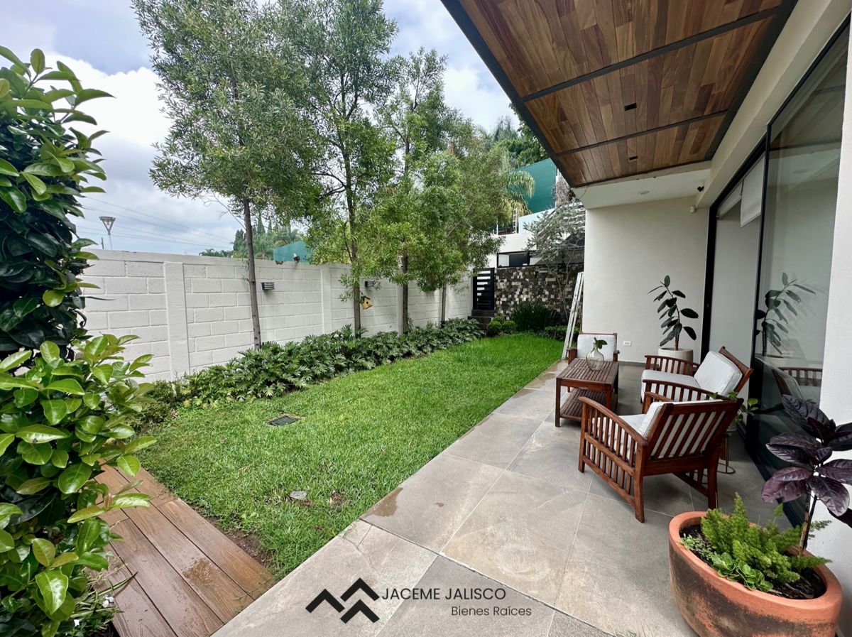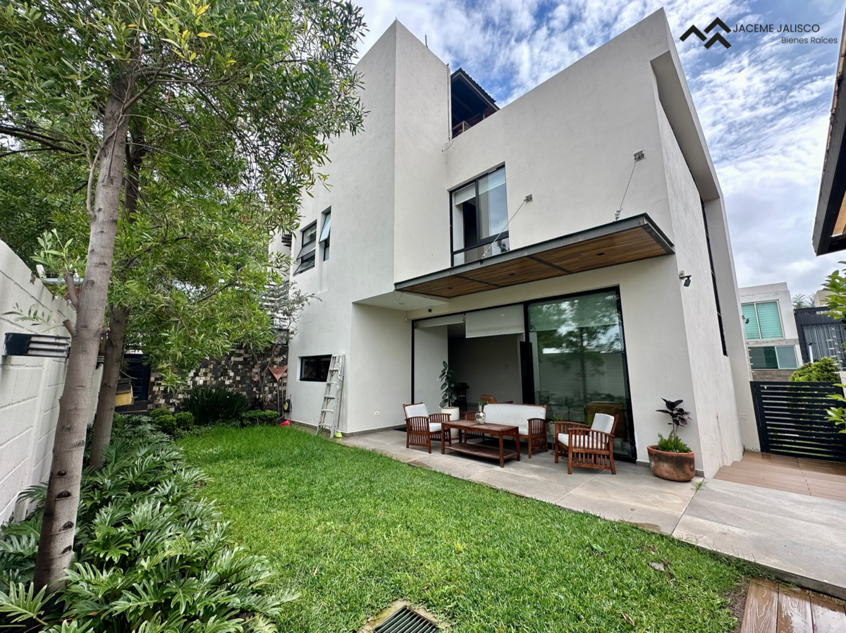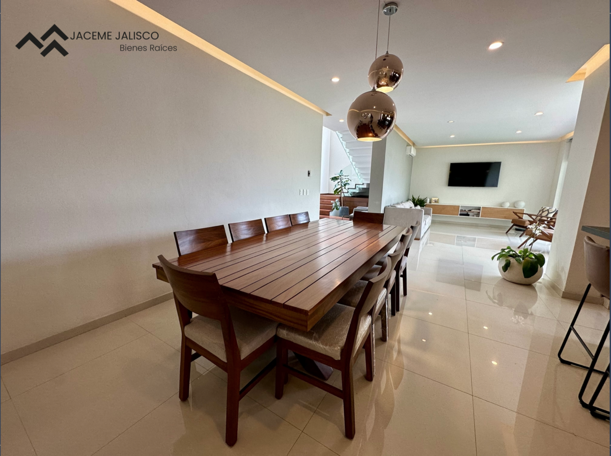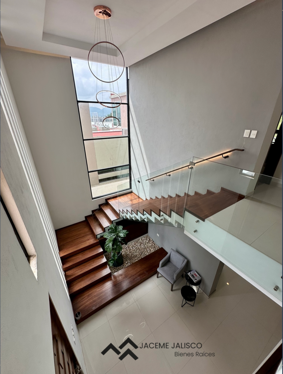 Planta baja: Hermoso recibidor a doble altura, amplia sala con hermosa vista a terraza y jardín, comedor, amplia cocina equipada. Recámara en planta baja con baño completo. Área de lavado. Acceso a Roof Terrace. Estacionamiento para 3 autos. Bodega.