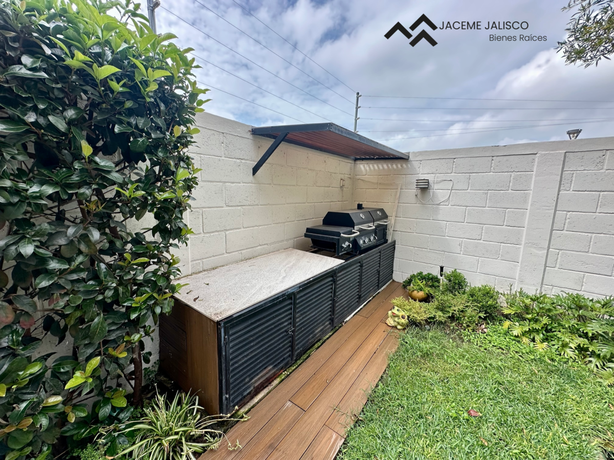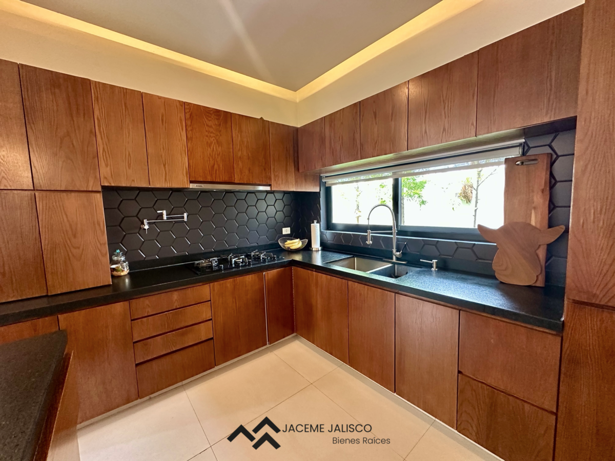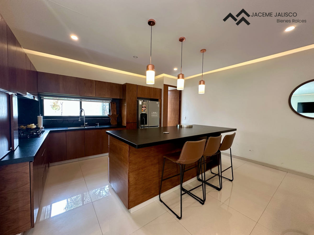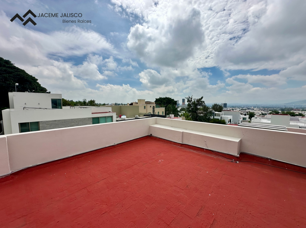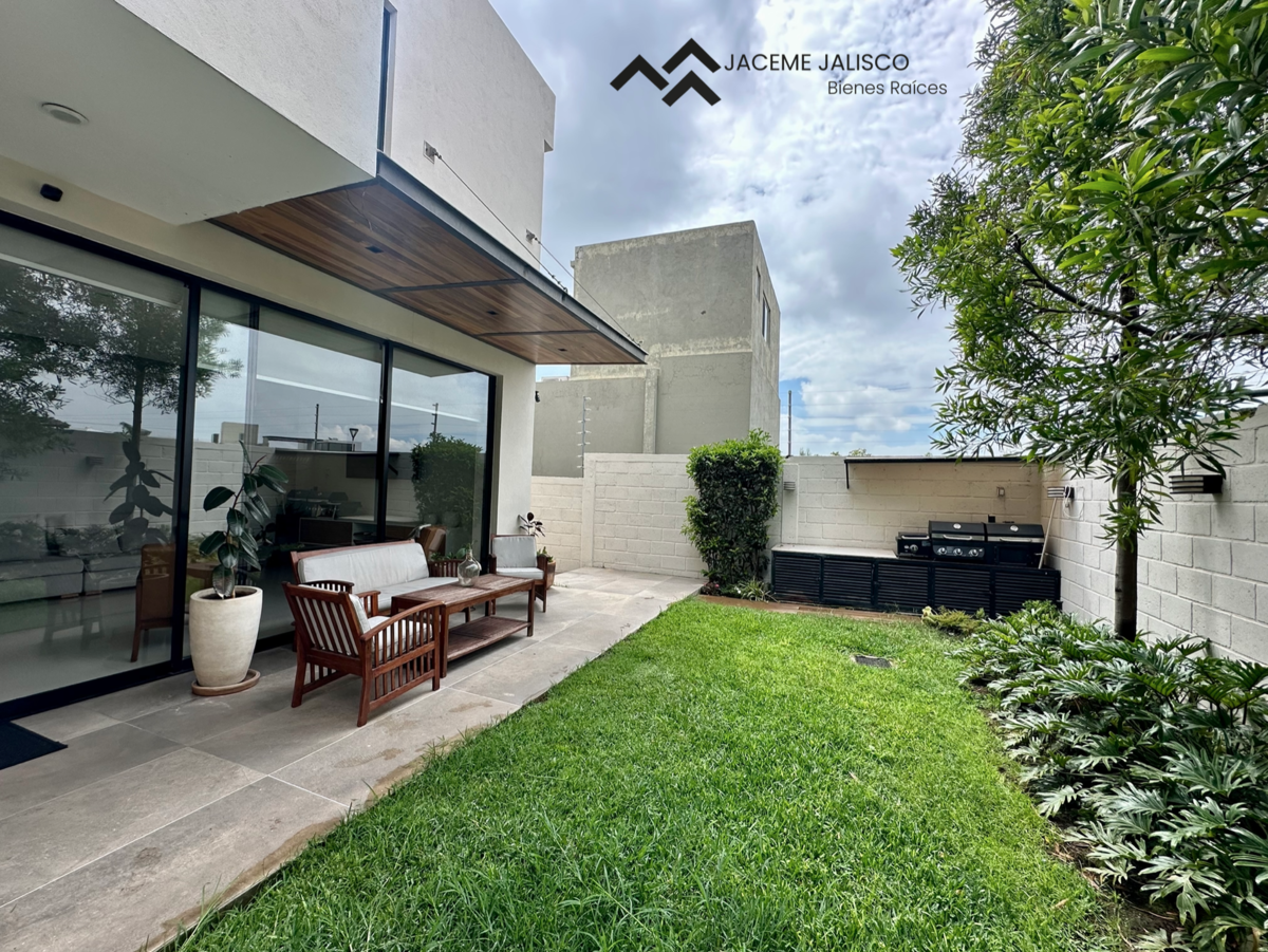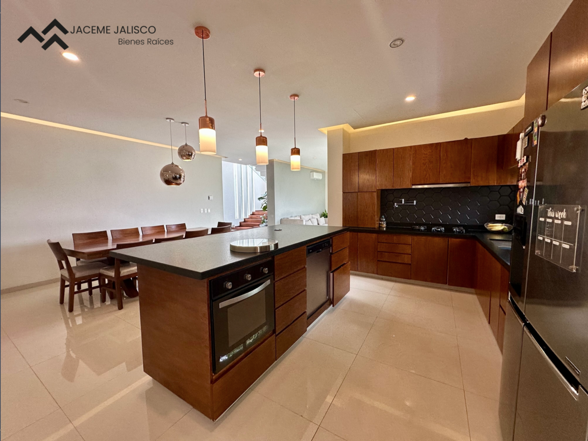Planta baja: Hermoso recibidor a doble altura, amplia sala con hermosa vista a terraza y jardín, comedor, amplia cocina equipada. Recámara en planta baja con baño completo. Área de lavado. Acceso a Roof Terrace. Estacionamiento para 3 autos. Bodega.