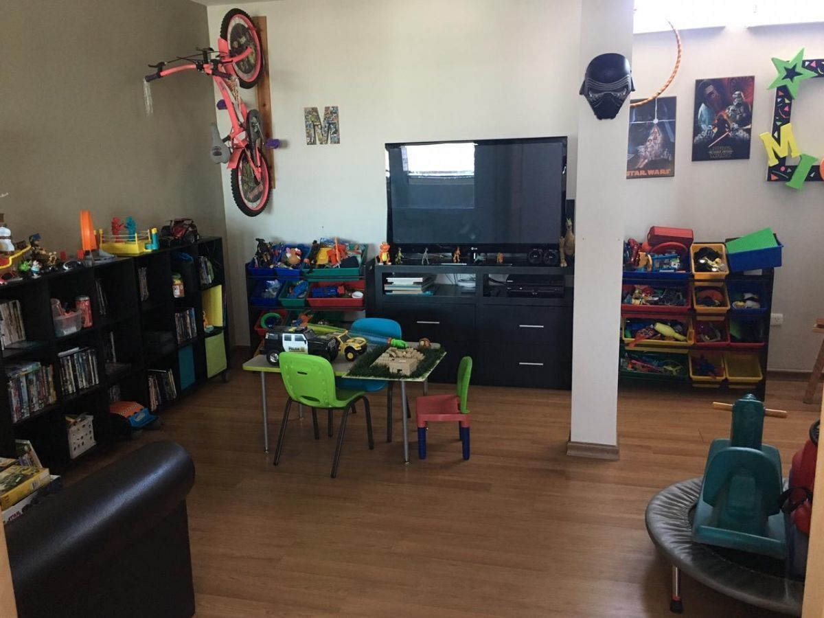 4 niveles Cuartos de juego, terraza techada, cava, taller, Alberca, jardín, cocina, sala, comedor, cuarto de servicio, cuarto de lavado, GYM, Sala de cine , 4 habitaciones, 3 baños completos, 2 medios baños.
