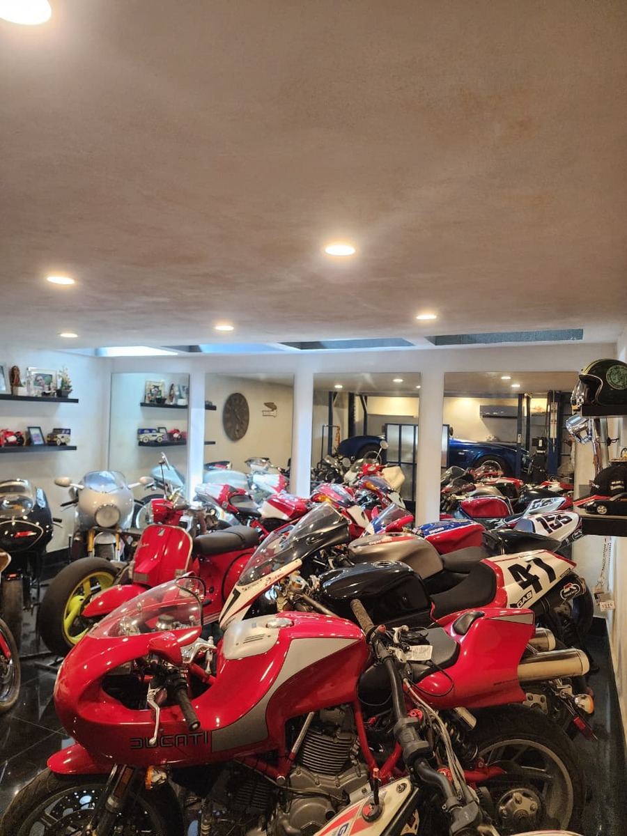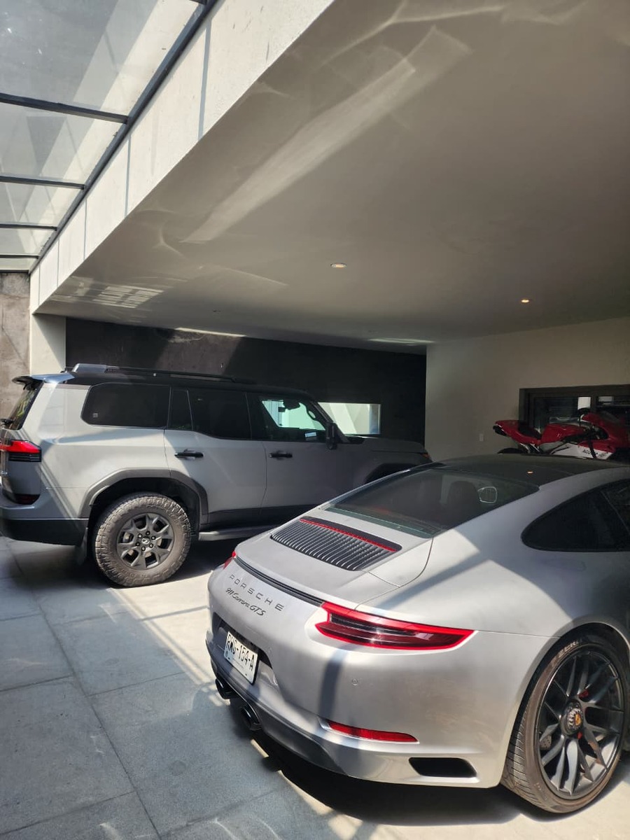 La zona social integra un diseño único que comunica visualmente con un garage tipo showroom, donde destaca un elevador para motos y autos deportivos, ideal para coleccionistas que aprecian la estética y la ingeniería por igual.
