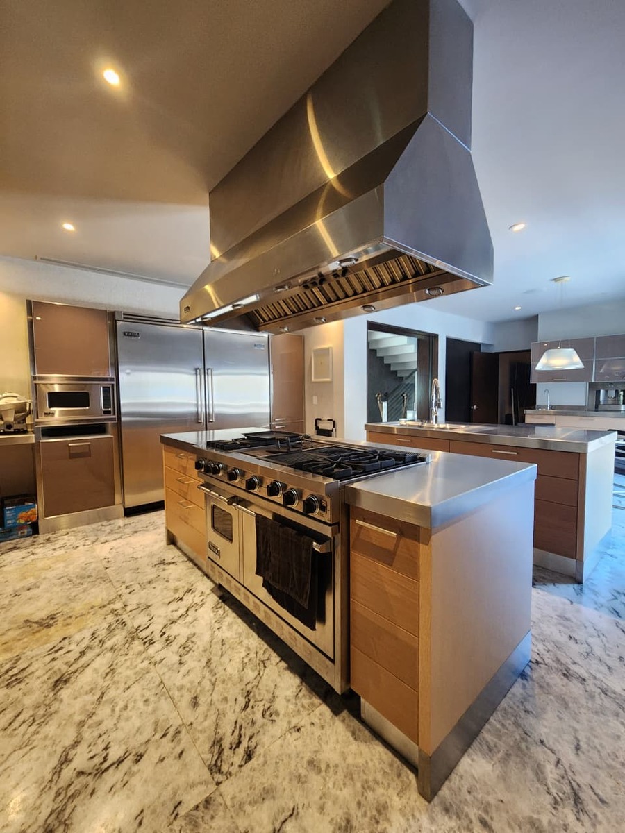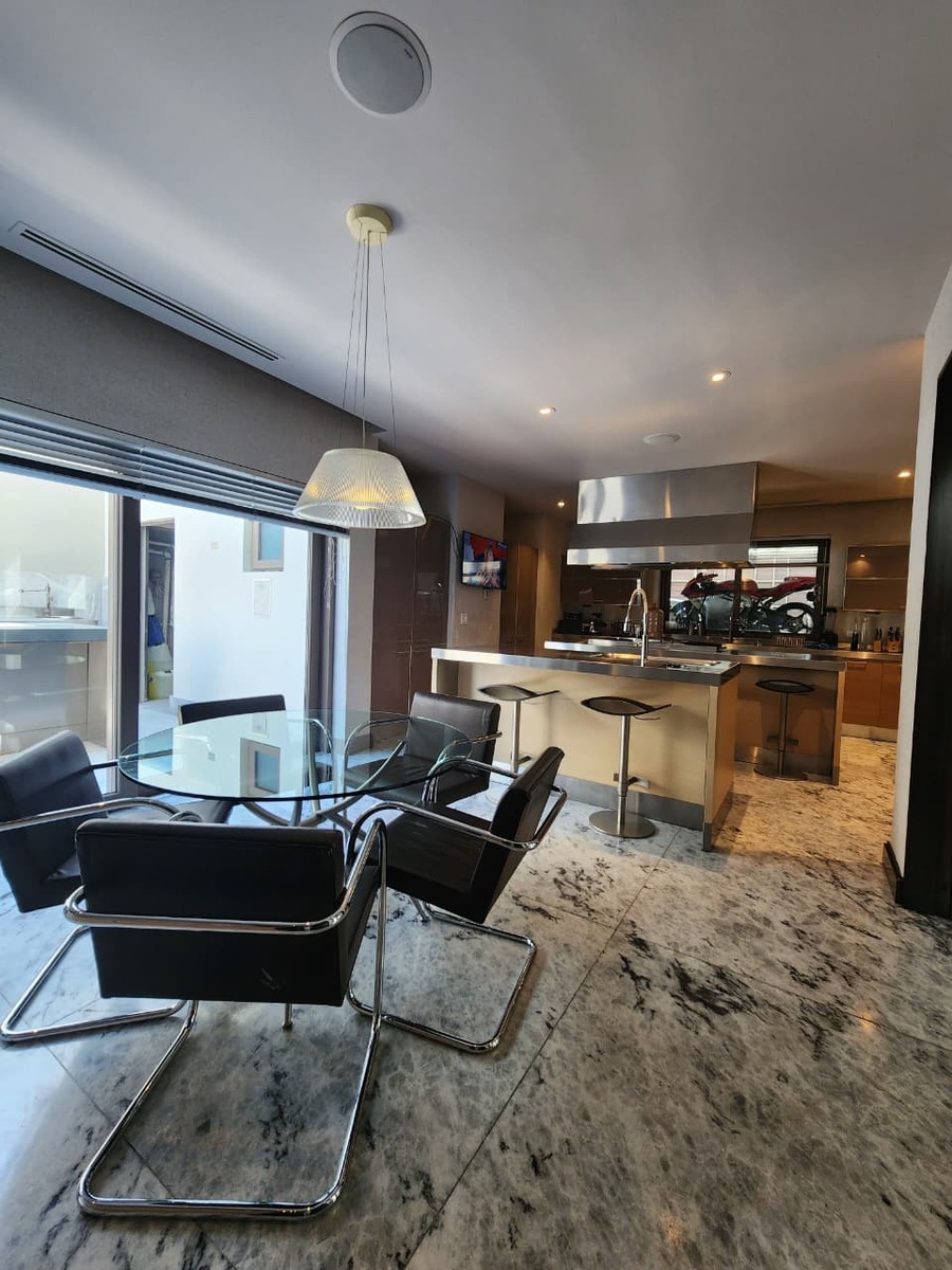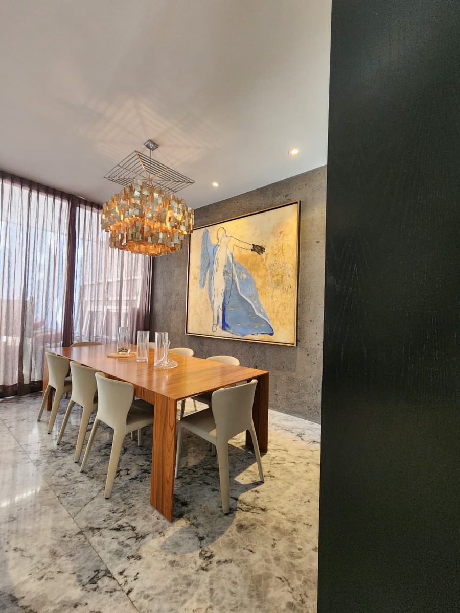 Al ingresar, los interiores revelan una atmósfera sofisticada: pisos de mármol importado, iluminación arquitectónica y ventanales que inundan los espacios con luz natural. La cocina, equipada con refrigerador Sub-Zero, barra de acero inoxidable y cubierta de granito, conecta de forma elegante con el comedor y la terraza exterior, generando un ambiente fluido y contemporáneo.