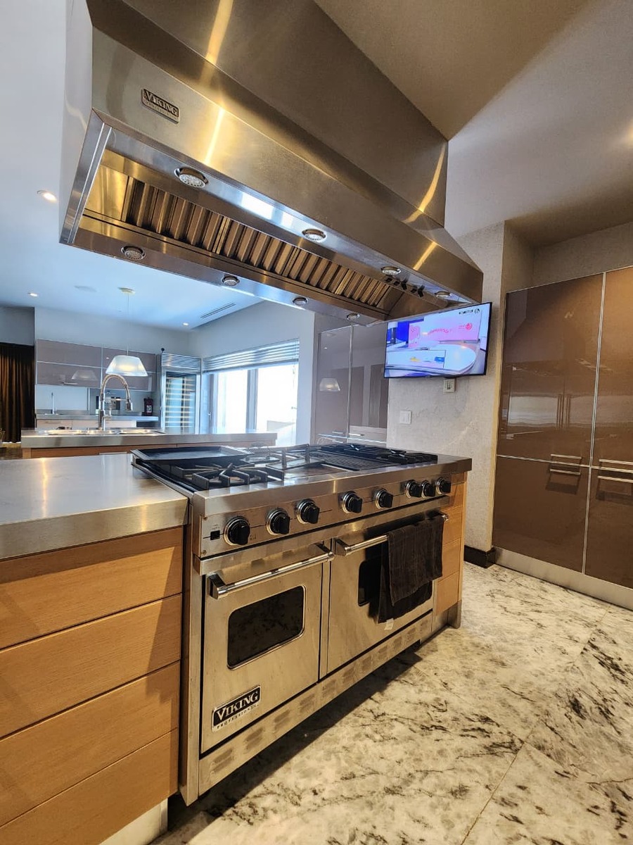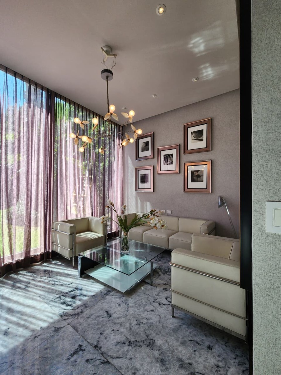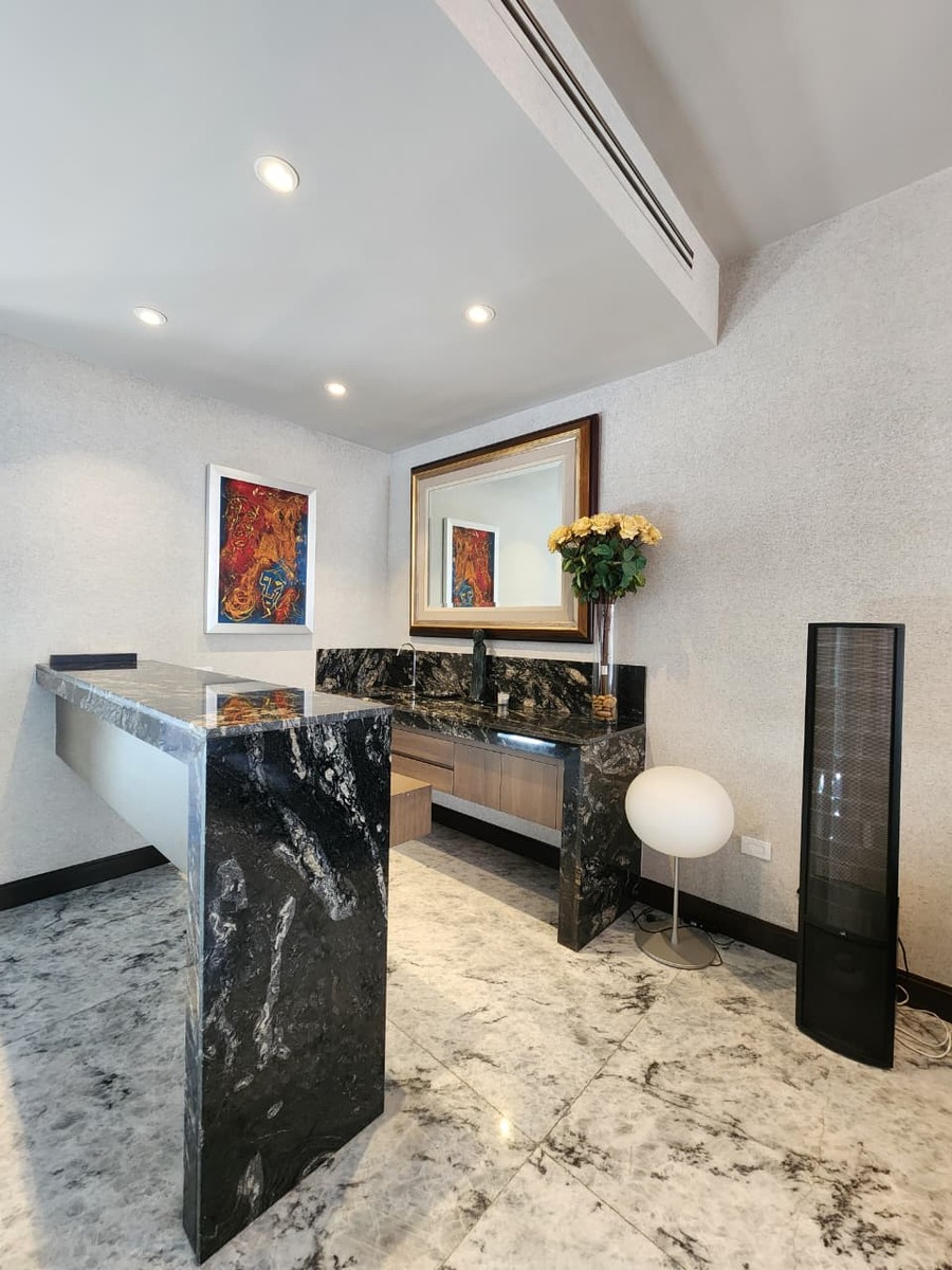 Al ingresar, los interiores revelan una atmósfera sofisticada: pisos de mármol importado, iluminación arquitectónica y ventanales que inundan los espacios con luz natural. La cocina, equipada con refrigerador Sub-Zero, barra de acero inoxidable y cubierta de granito, conecta de forma elegante con el comedor y la terraza exterior, generando un ambiente fluido y contemporáneo.