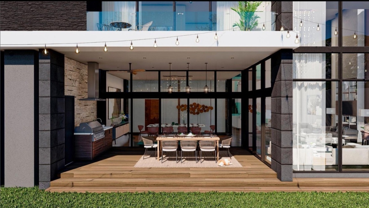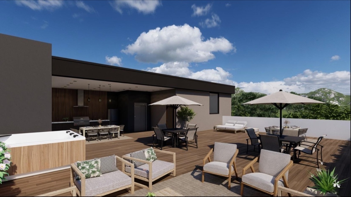 - Covered rooftop with social area, bathroom, bar with sink, and grill