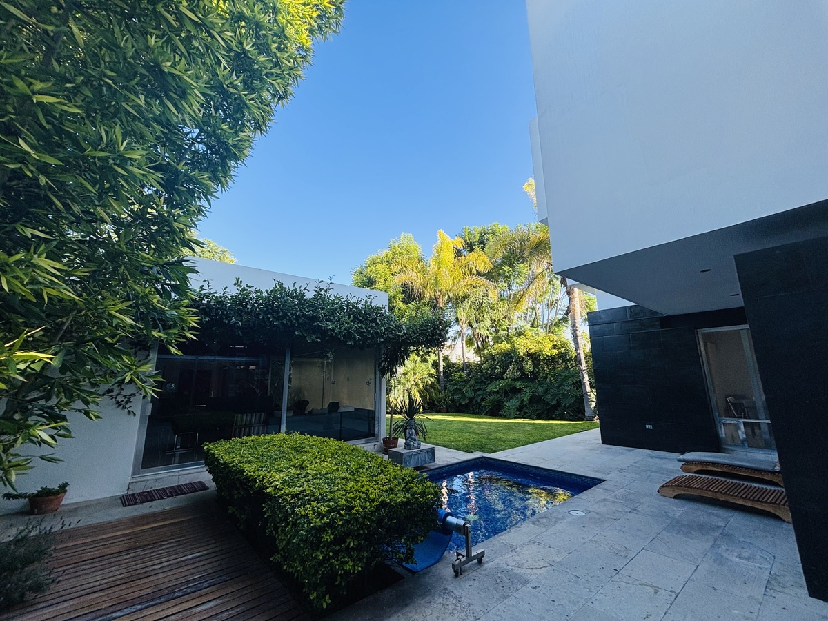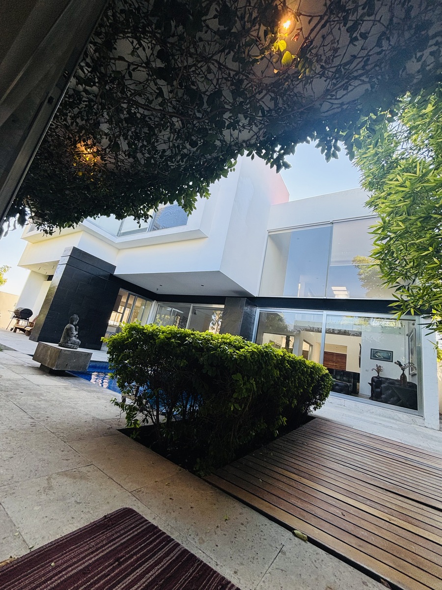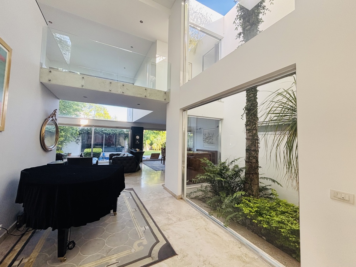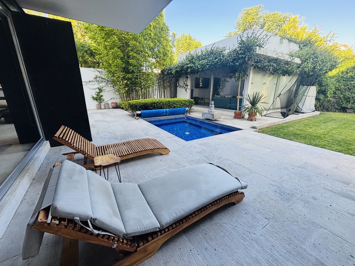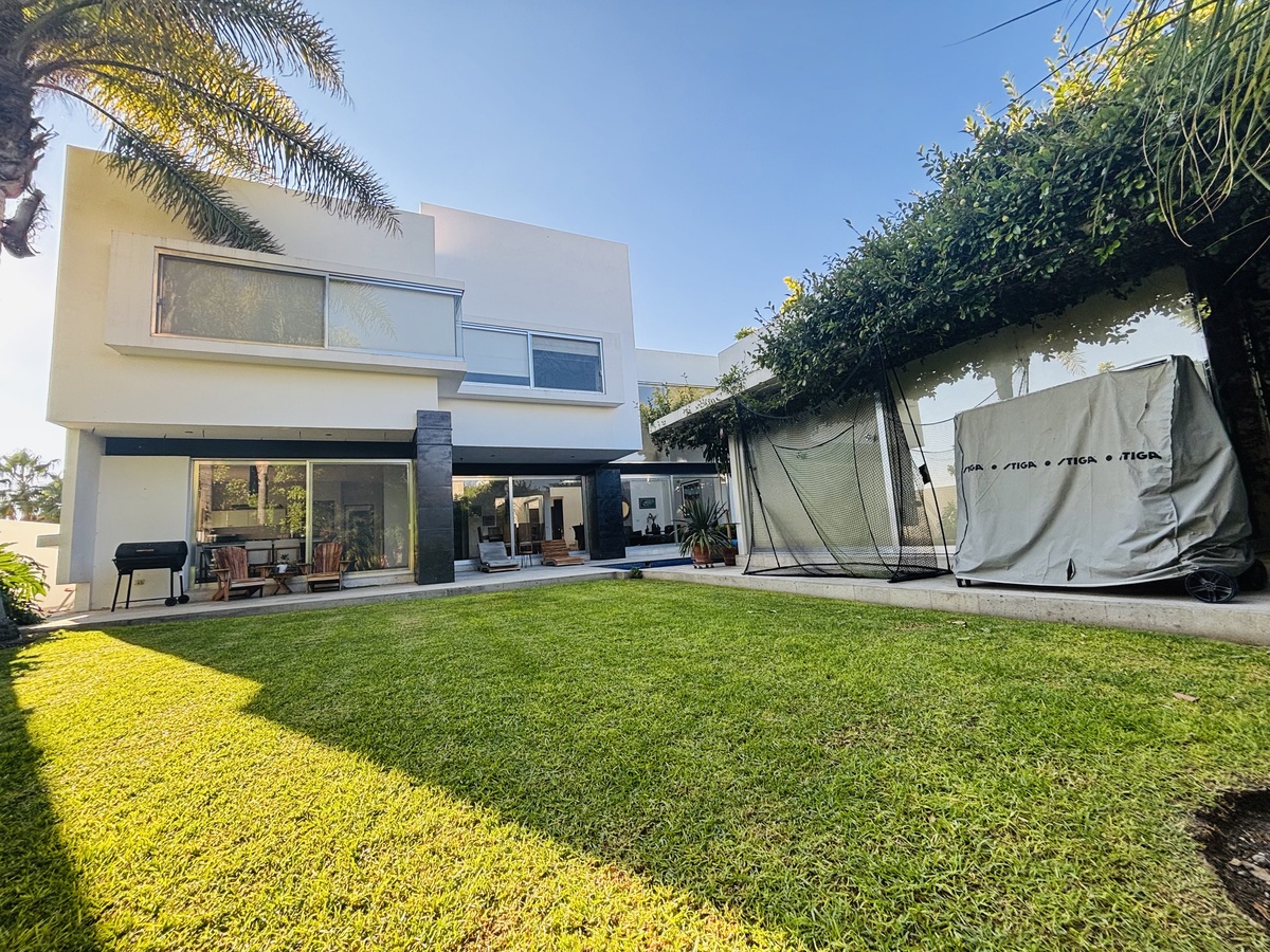 PB: cochera para 6 autos, entrada a doble a altura con espacio de distribución, sala a doble altura, comedor, ventanal con salida hacia el jardín y alberca con calefacción, cocina equipada con espacio para ante comedor, gran espacio de alacena, área de lavado, área de tendido, baño de visitas, amplio jardín, pasillo de servicio, bungalow independiente que puede usarse como estudio o área de juegos, con baño.