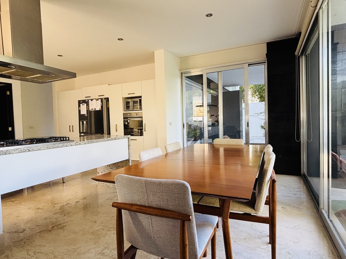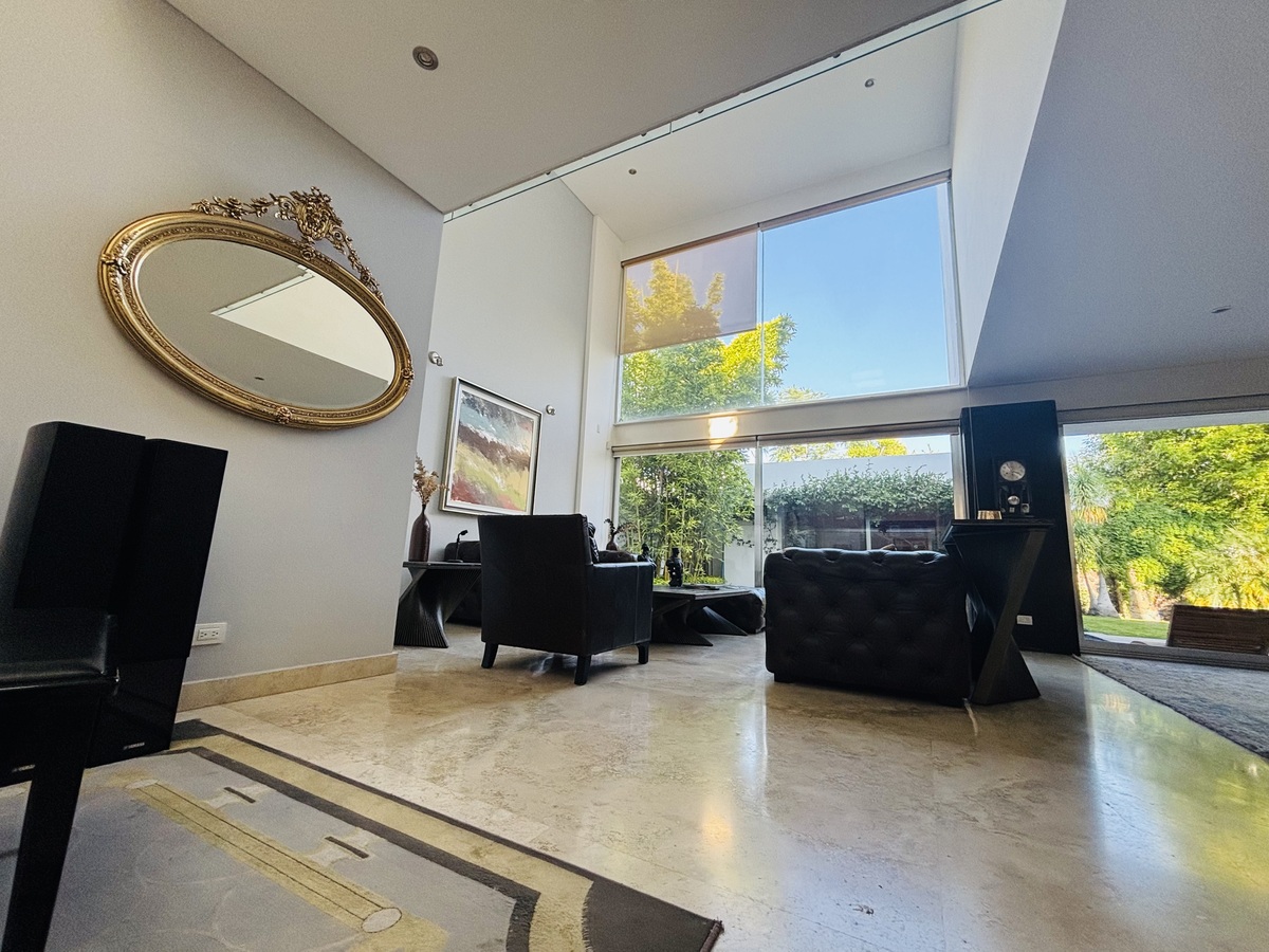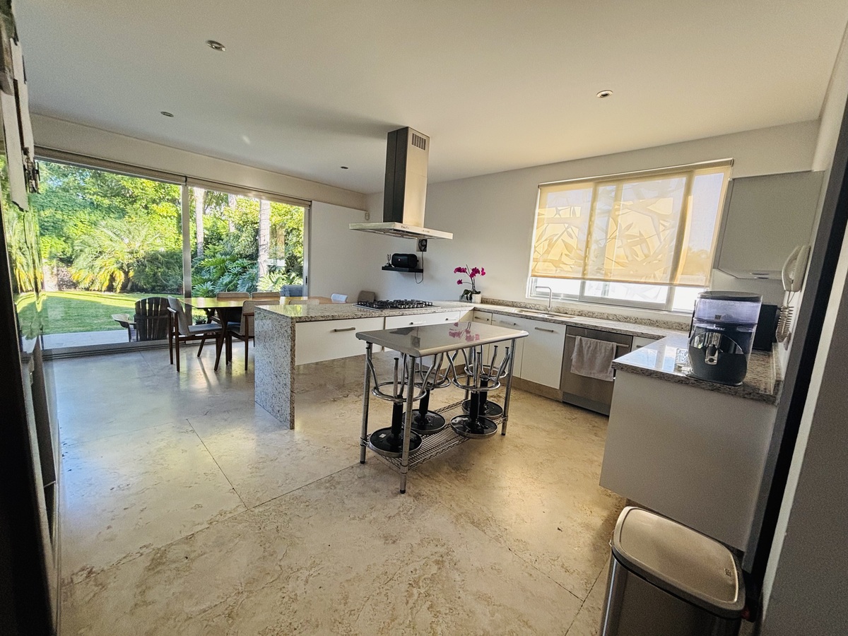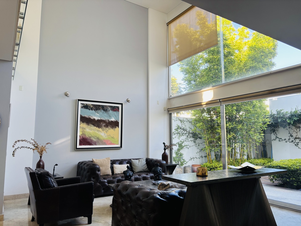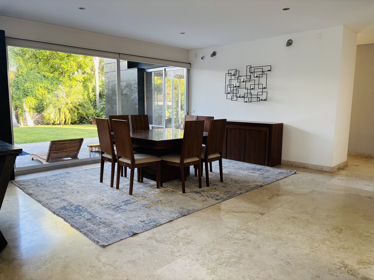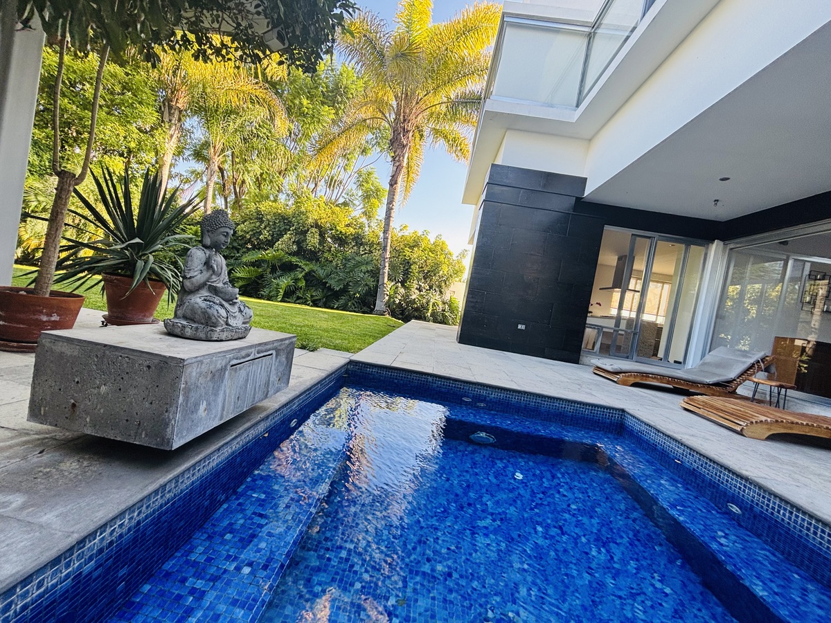 PB: cochera para 6 autos, entrada a doble a altura con espacio de distribución, sala a doble altura, comedor, ventanal con salida hacia el jardín y alberca con calefacción, cocina equipada con espacio para ante comedor, gran espacio de alacena, área de lavado, área de tendido, baño de visitas, amplio jardín, pasillo de servicio, bungalow independiente que puede usarse como estudio o área de juegos, con baño.