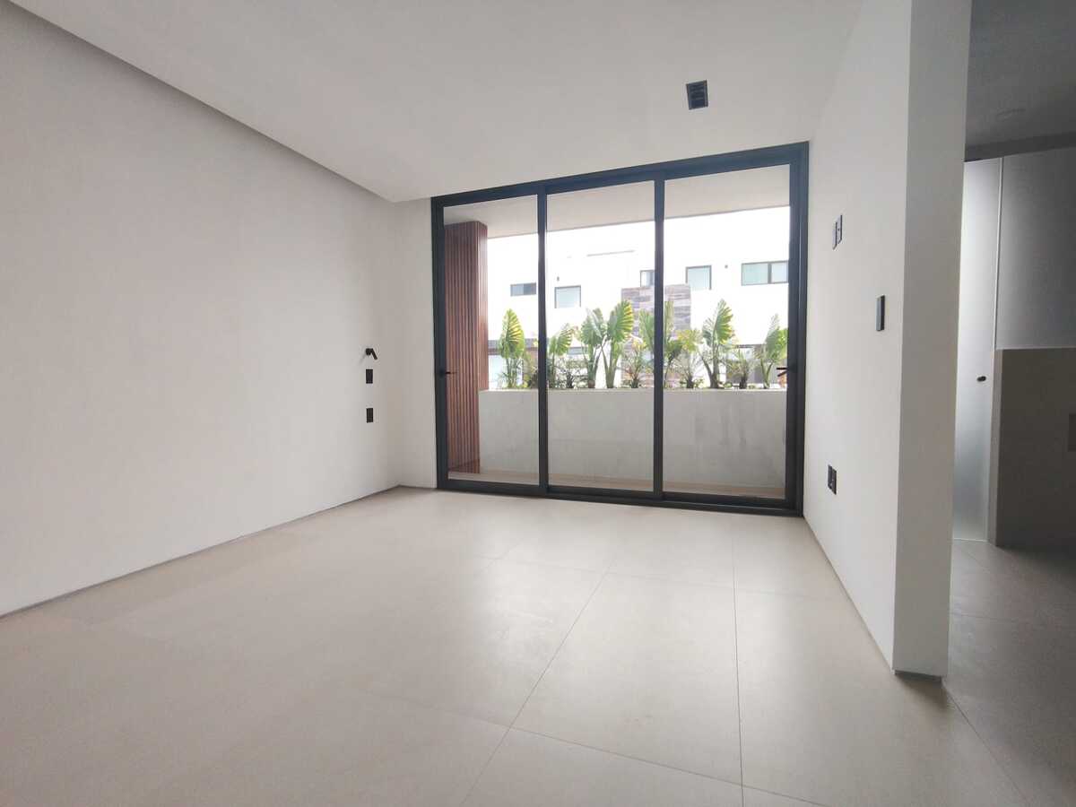 Primer nivel: Estancia corrida (sala- comedor), medio baño de visitas, cocina integral abierta, se une con un pequeño jardín zen interior y al fondo otro jardín.