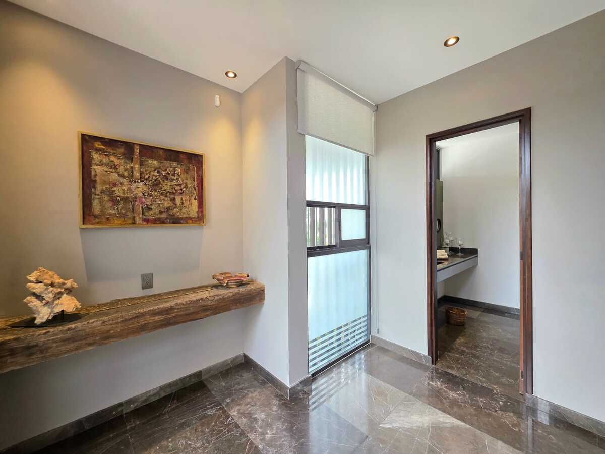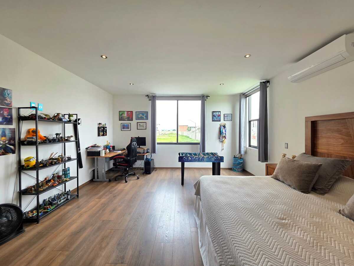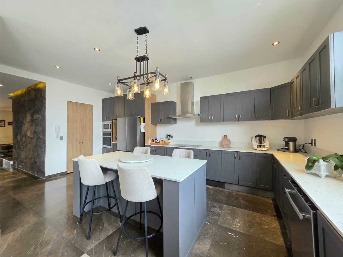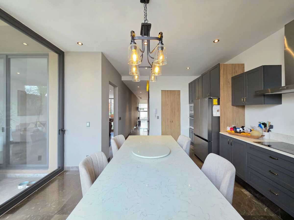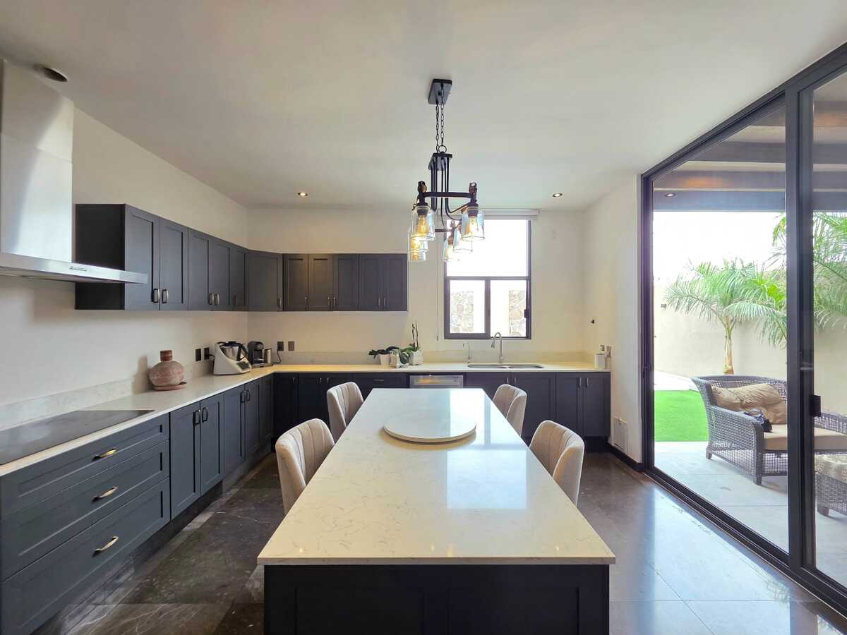 La casa cuenta con 4 amplias habitaciones, cada una con su baño privado, así como un baño de invitados y un baño de servicio. La distribución interior incluye un recibidor, vestidor, estudio, cuarto de lavado y cuarto de servicio. Además, la cocina está equipada con electrodomésticos empotrados, una barra de desayuno y cubiertas de granito, perfectas para inspirar al chef que lleva dentro.