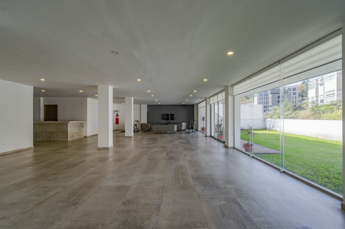 Jardín en primer piso con salón de eventos para 200 personas y baños de servicio, cocina y barra.