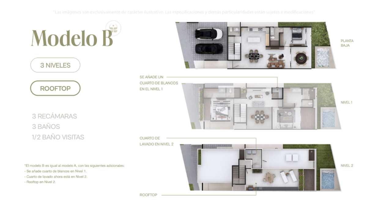 *Las imágenes son únicamente ilustrativas corresponden a la casa muestra y rendes para ejemplificar la distribución arquitectónica de los modelos, la casa no se vende amueblada.
