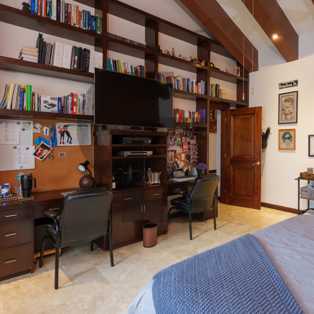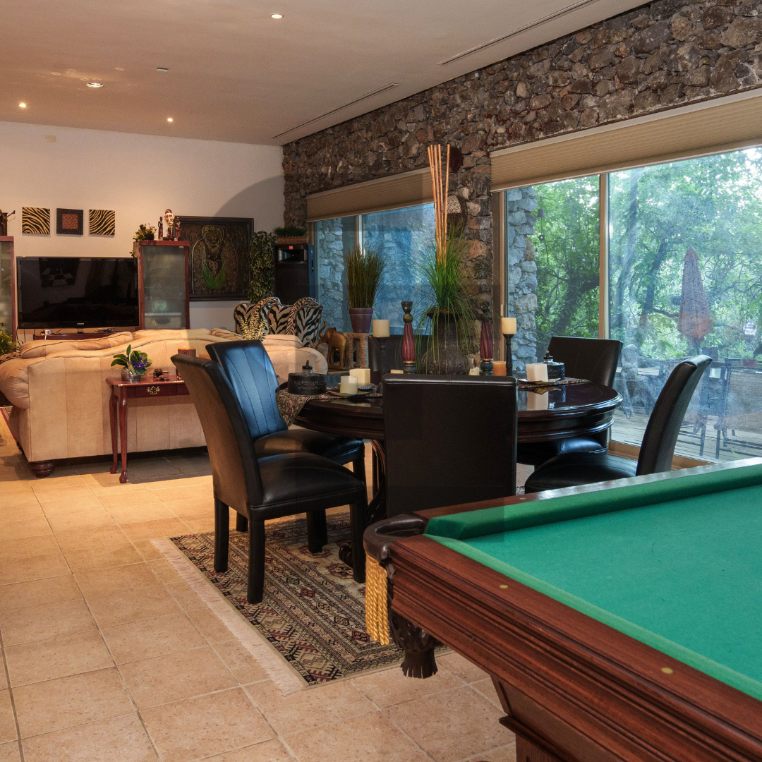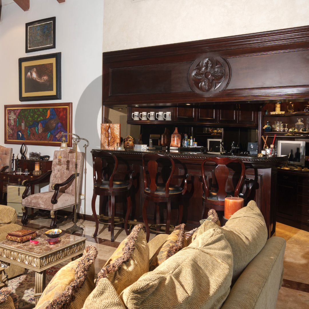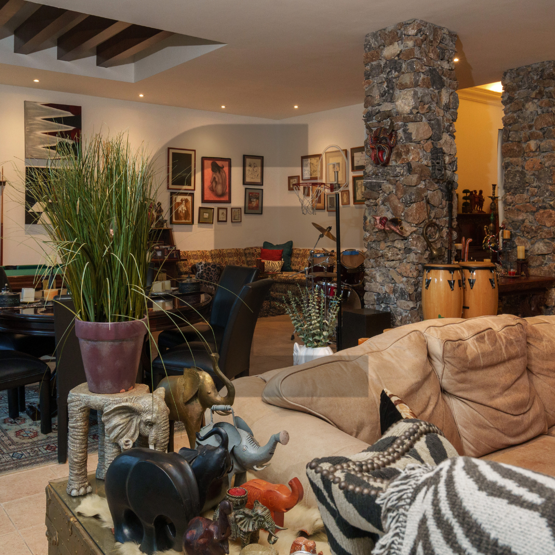 Cuenta con amplias areas sociales como sala con doble altura y bar, biblioteca, estancia TV, comedor antecomedor, cocina con alacenas, 4 amplias recámaras con buen baño y vestidor, Cuarto de juegos con doble altura, tiene su propia cocina y baño completo,( si quisieras podría ser un departamento independiente).