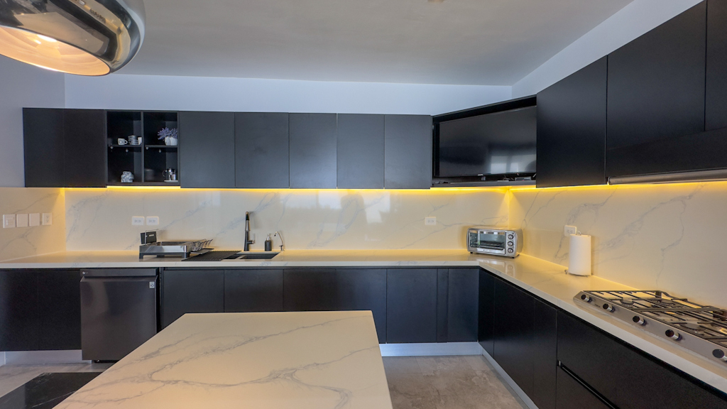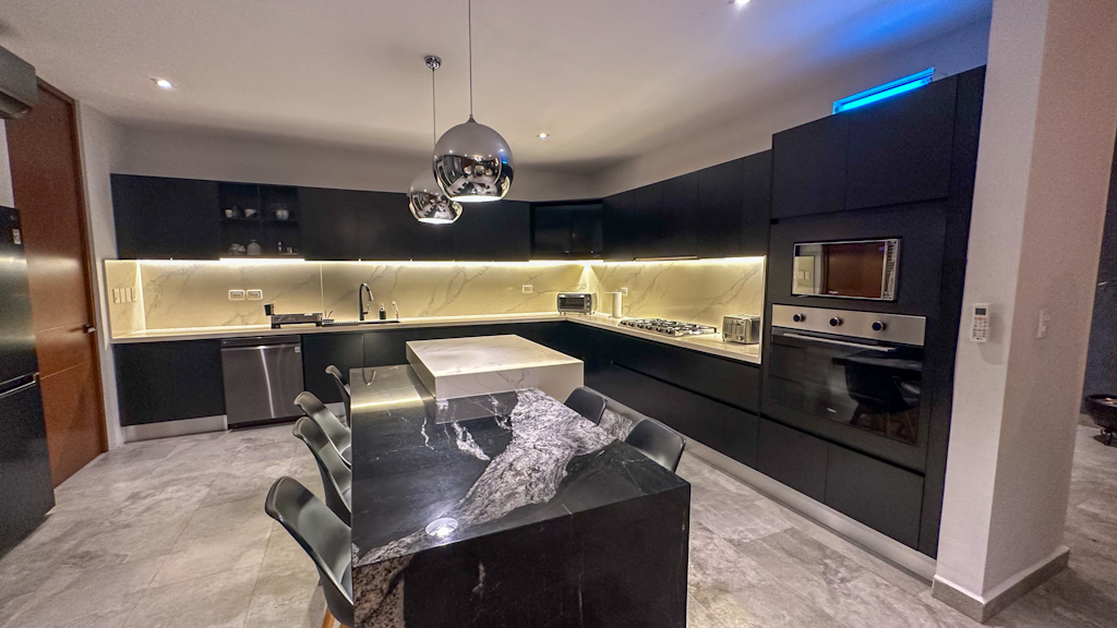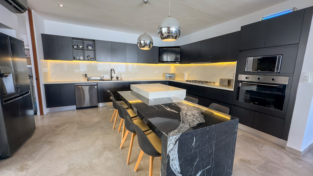 - Cocina: mesetas de cuarzo en toda la cubierta incluyendo back splash y mármol negro estelar en isla.