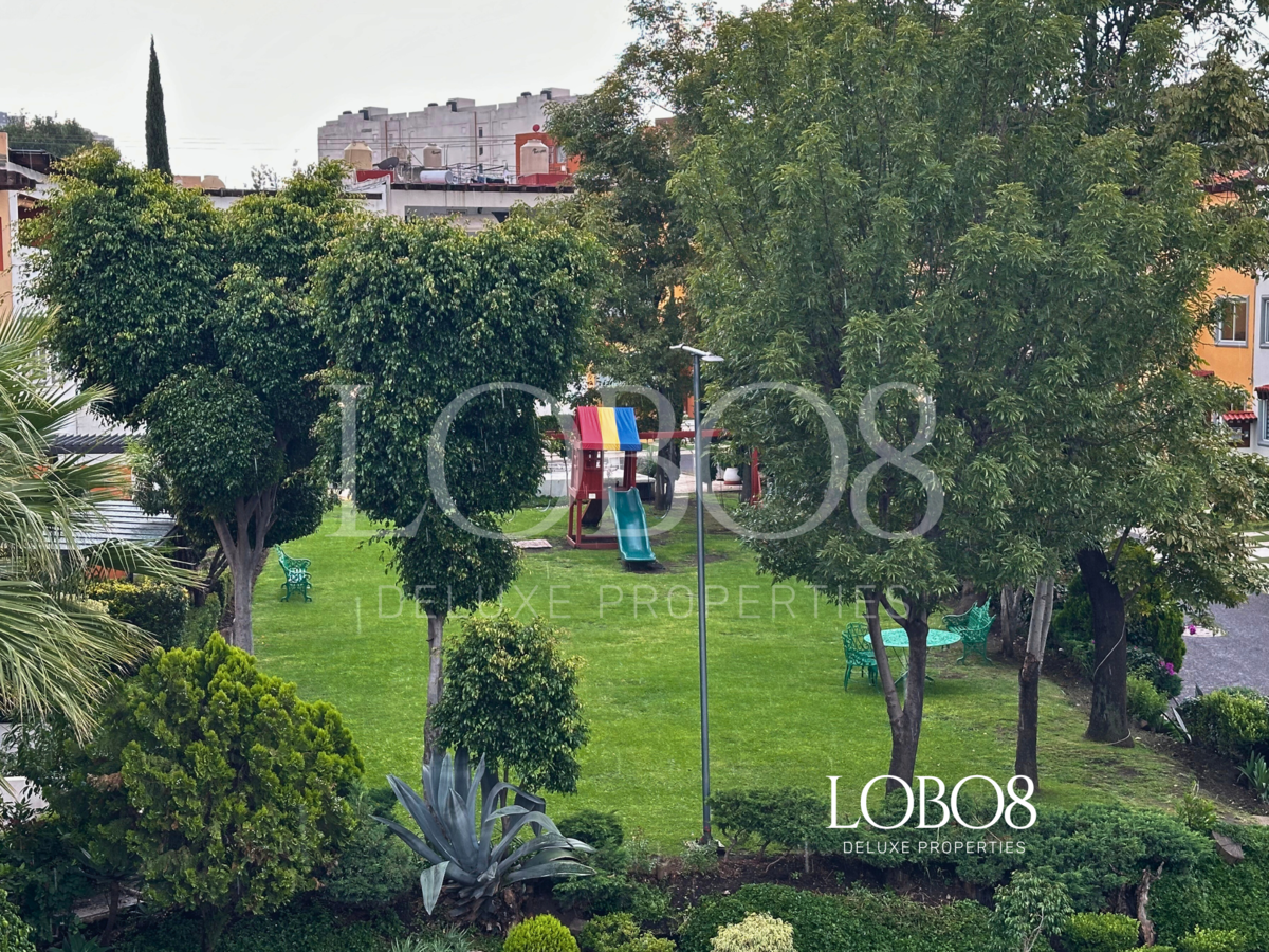 -JardĂn central con juegos infantiles y amplias áreas verdes.