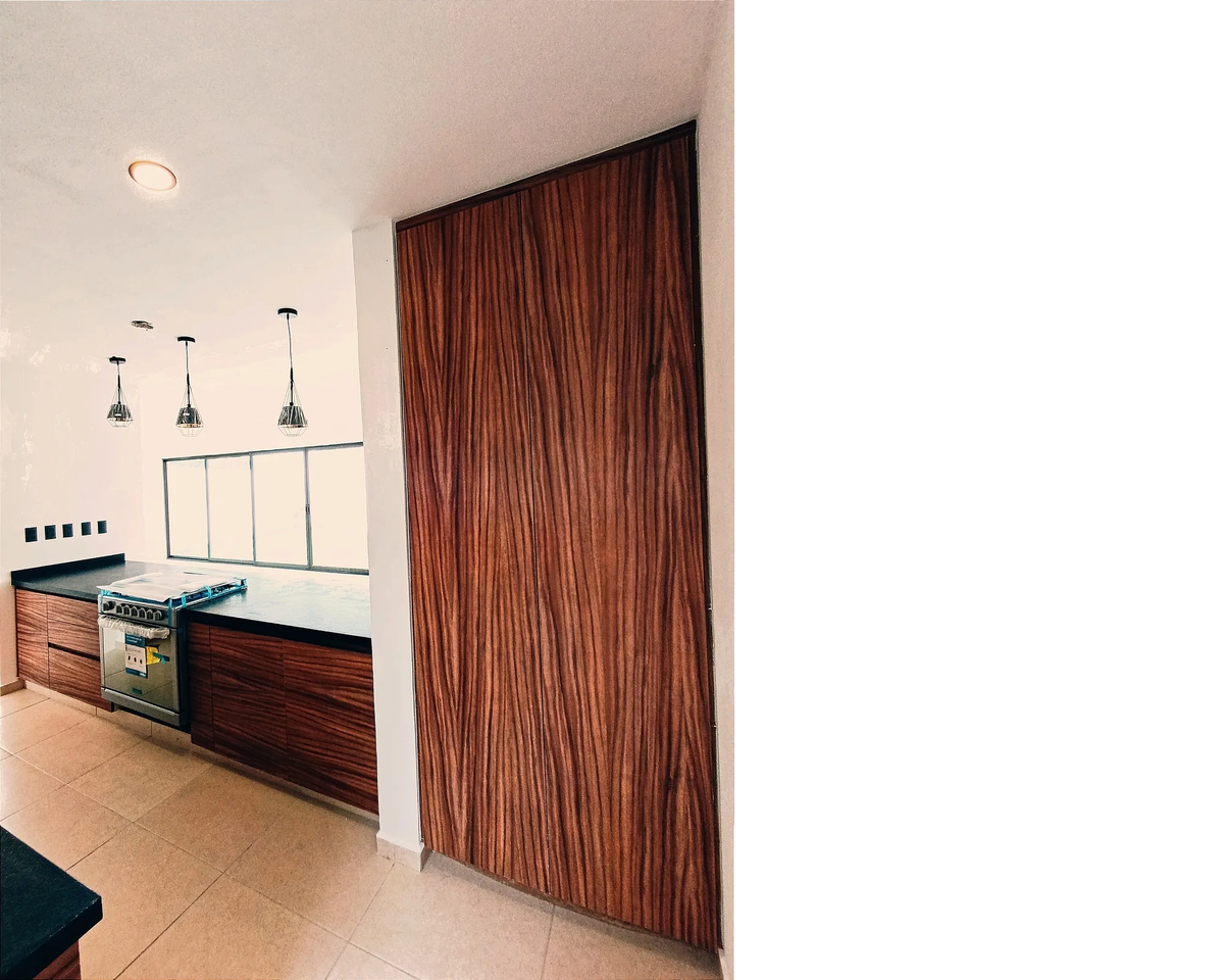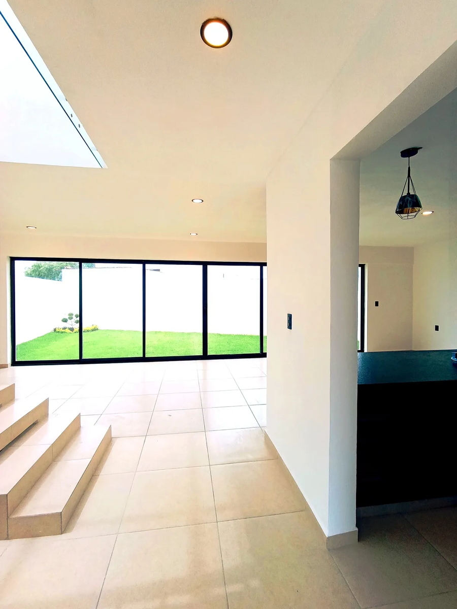 Cochera para dos autos, recámara o estudio, baño completo, cocina equipada con barras de granito, área de lavado, sala comedor, jardín.