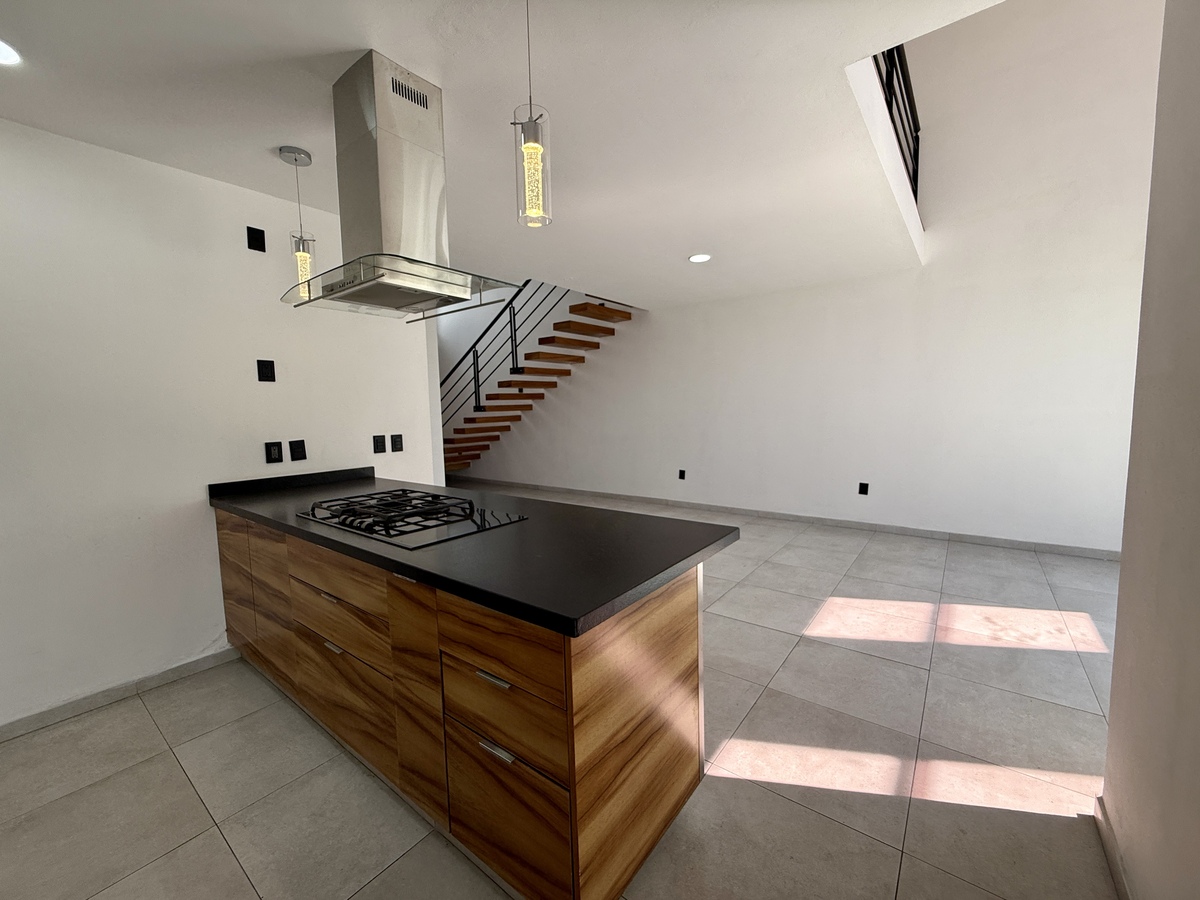 - cocina integral con estufa híbrida: a gas y eléctrica, barra de granito