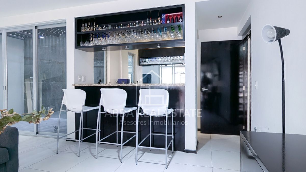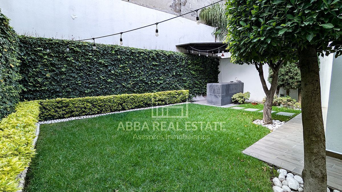 PLANTA BAJA: Cuenta con terraza en la entrada principal, amplio estudio, baño y closet de visitas, cocina integral equipada con barra, despensa, estancia y comedor, terraza y jardín con asador techado con tarja y barra y muro verde en jardín y terraza.