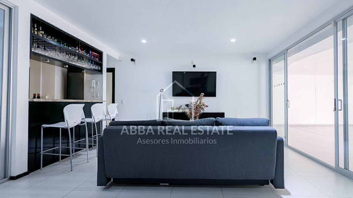 SOTANO: Bar o sala de juegos, con barra, contra barra con mueble y espejo, rack para copas, rack para vinos, tarja y mueble TV, terraza interior, closet visitas, área de lavado y tendido, bodega grande, cuarto de servicio con baño, portón eléctrico, estacionamiento techado para 3 autos, 2 medios baños en área de bar y/o estacionamiento y bodega.