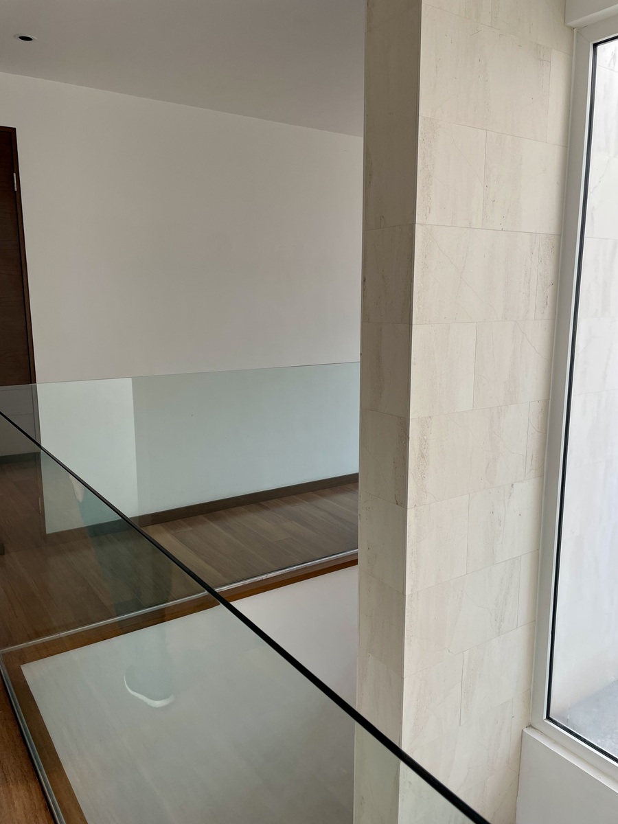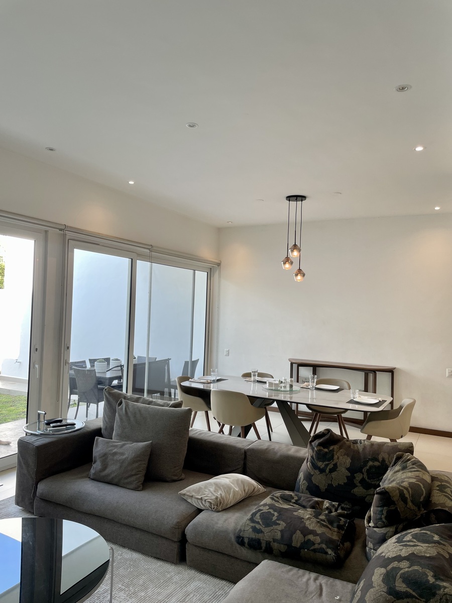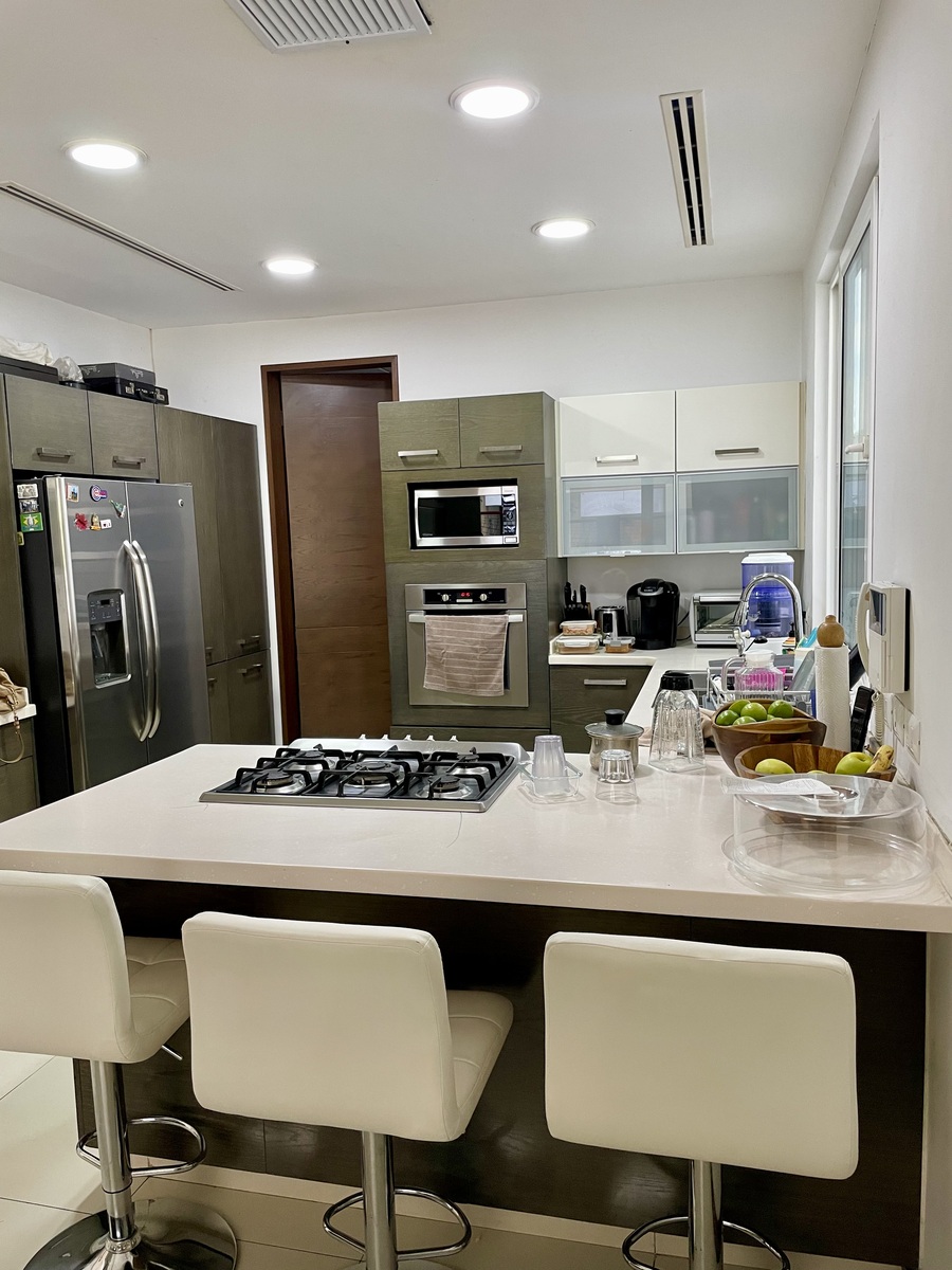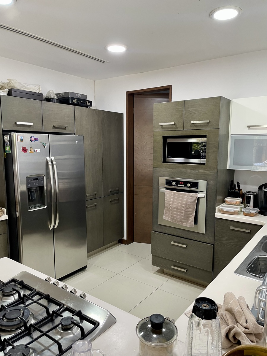 Clima central seccionado, cocina, persianas, abanicos de techo y algunos muebles empotrados, pisos de porcelanato y duela, closets y canceles de baño.