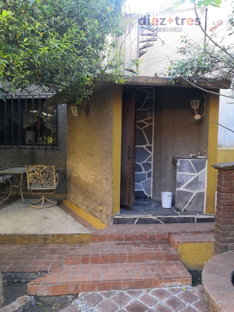 -Jardín central con área de asador y medio baño, una construcción en la parte de atrás de dos pisos.