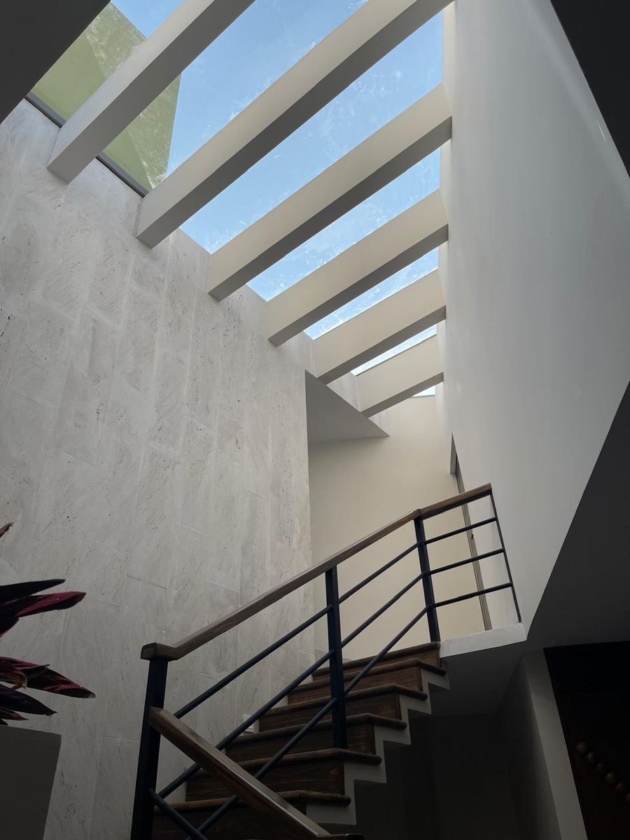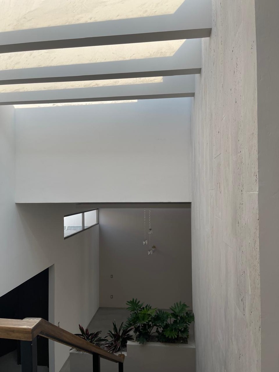 Planta baja: Estudio, medio baño, vestíbulo bien iluminado con techo pergolado y jardinera.