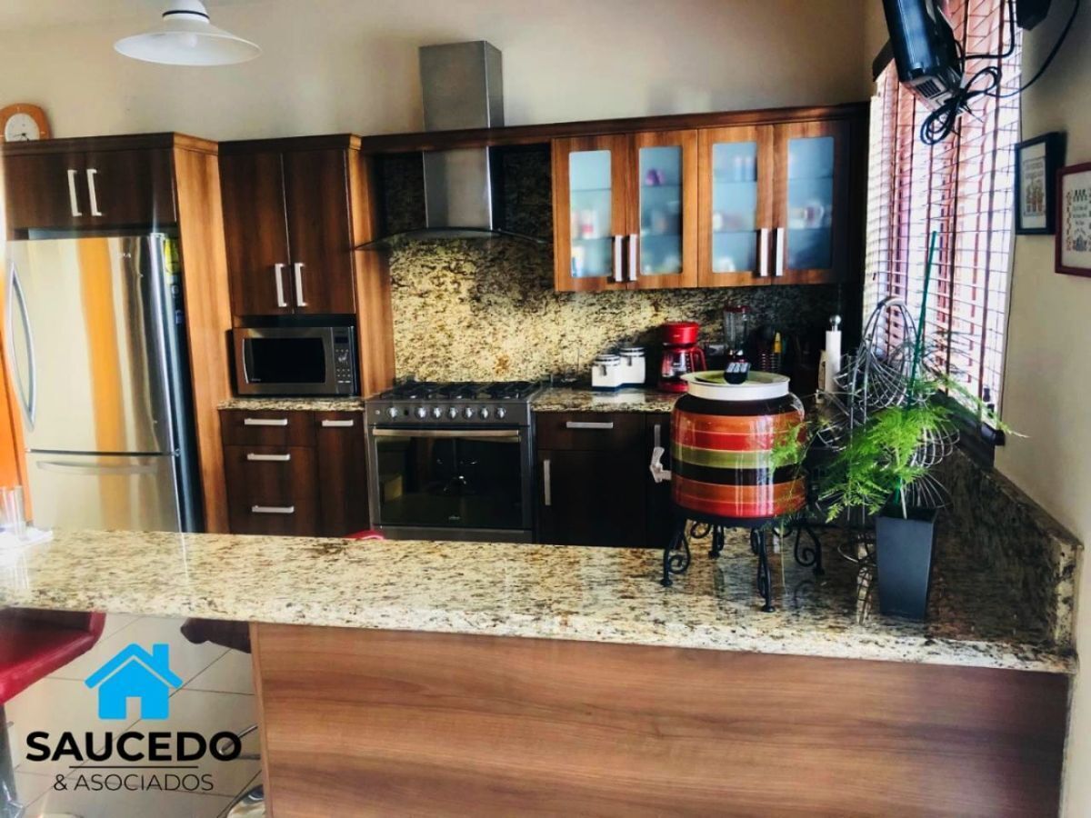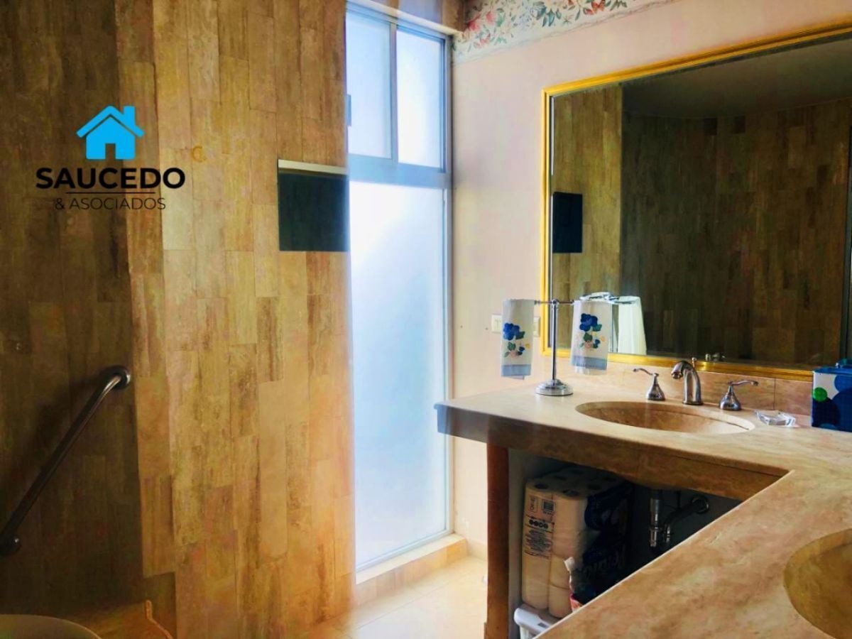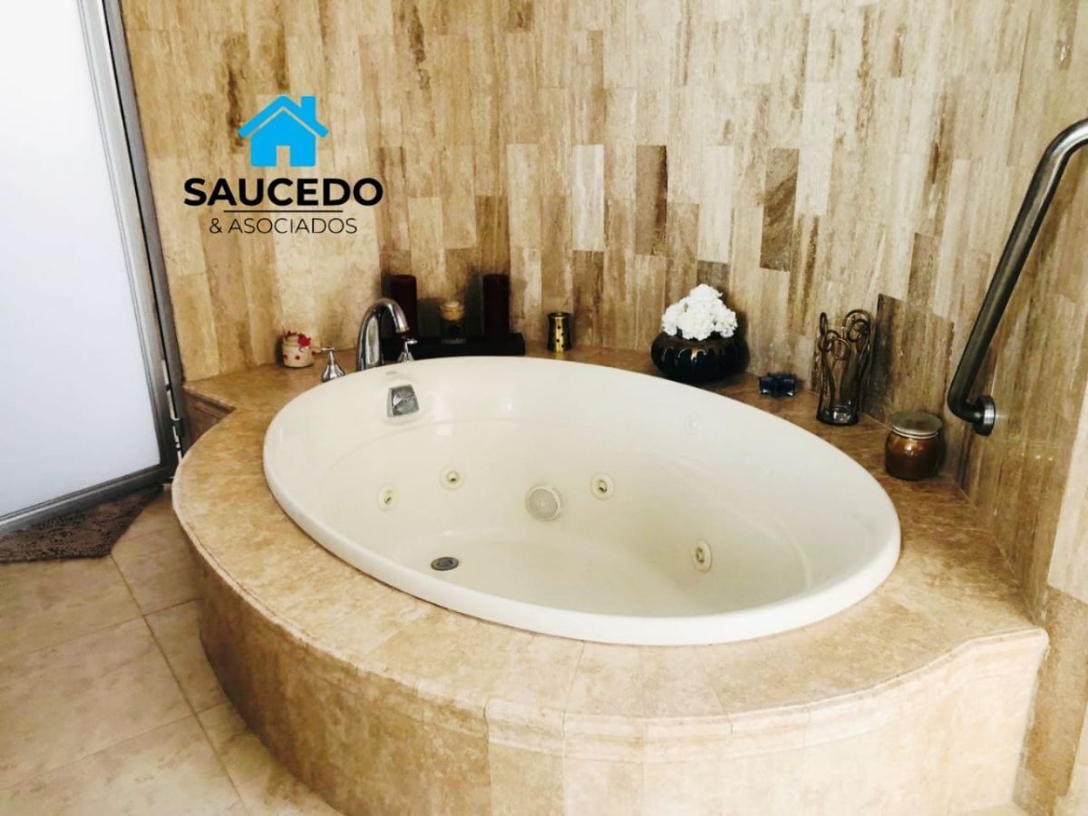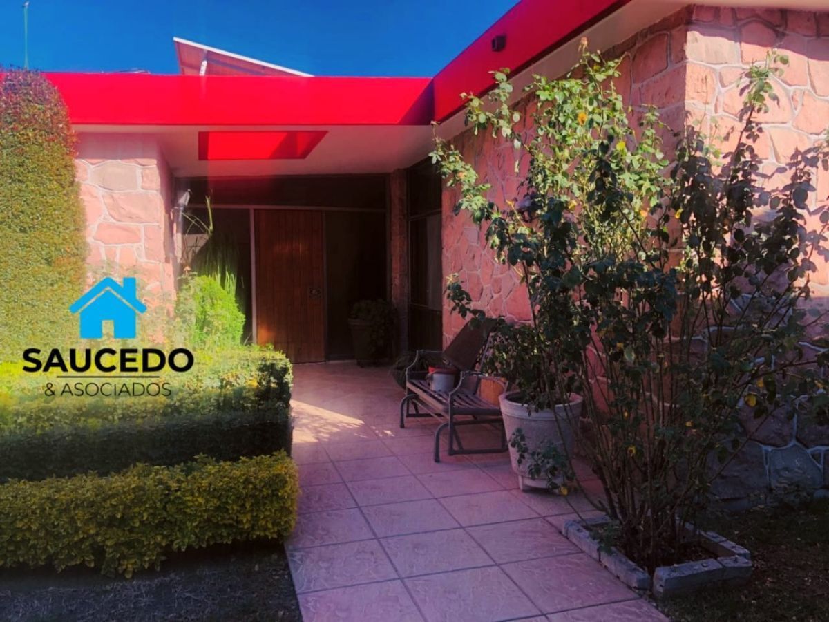 La casa esta construida en una sola planta rodeada de hermosos jardines con riego automatizado , cuenta con cochera techada para dos vehículos, sala comedor con chimenea, cocina con cubierta de granito, tres recamaras cada una con closet comparten un baño completo. un amplio pasillo que nos lleva a la cuarta recamara que cuenta con vestidor, baño completo ,tina de hidromasaje y cuarto de vapor, área para oficina o sala de tv, cuarto de servicio en una segunda planta