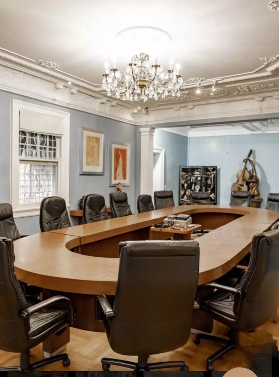 Ground floor: reception area, 2 meeting or exhibition rooms, dining area, archive, and warehouse. Half a level up, an office with a bathroom.