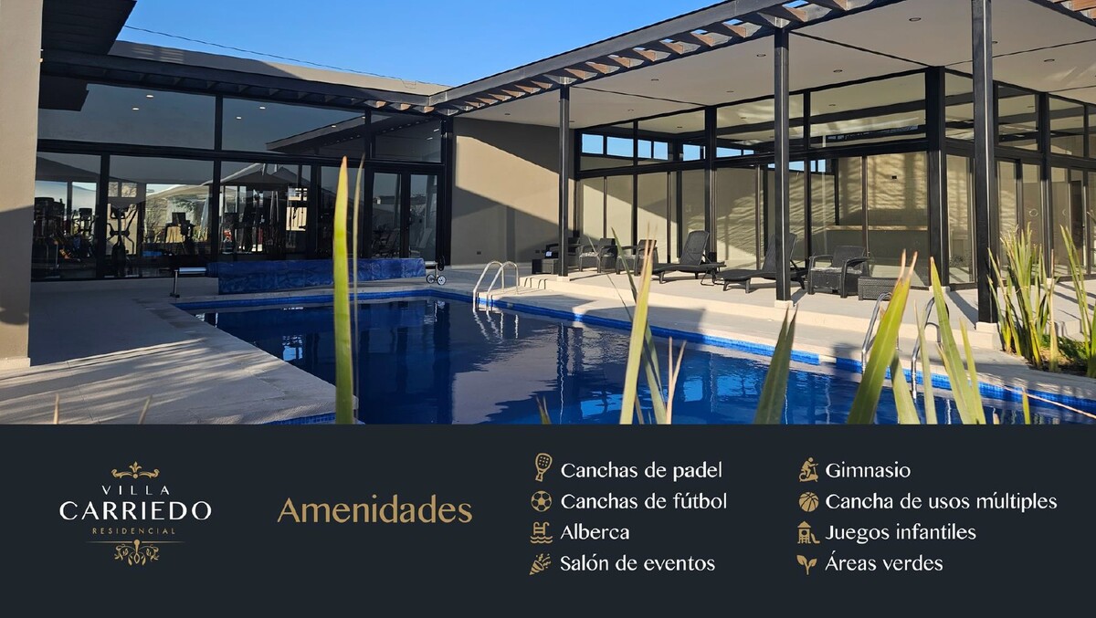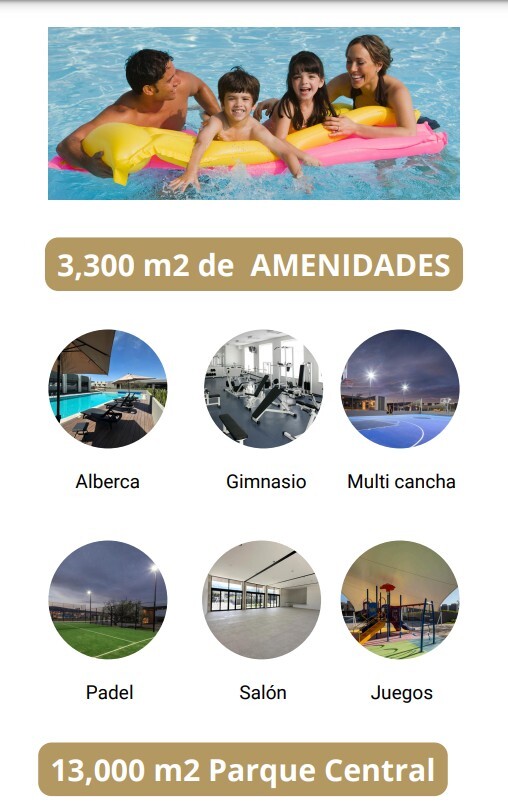 Disfruta de una conectividad inigualable y residencias de diseño abierto, donde cada espacio refleja lujo, confort y seguridad. Desarrollo Eco Friendly enfocado en tu seguridad. Paneles fotovoltáicos (medidores de energía bidireccionales). Gas natural. Baños ahorradores. Captación y aprovechamiento de agua pluvial en áreas comunes. Riego por aspersión en áreas comunes. Doble Acceso Controlado, Circuito Cerrado de Televisión, Malla Electrificada en el perímetro. Contamos con un parque central de 13,000 m2 con lago panorámico además de 3 parques secundarios de 3,300 m2 con alberca, salón de eventos, juegos infantiles y gimnasio.