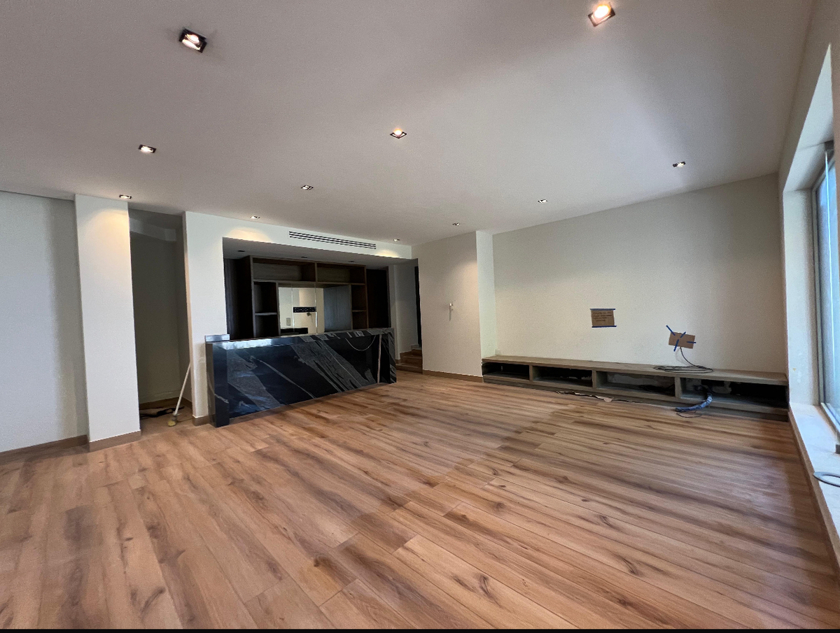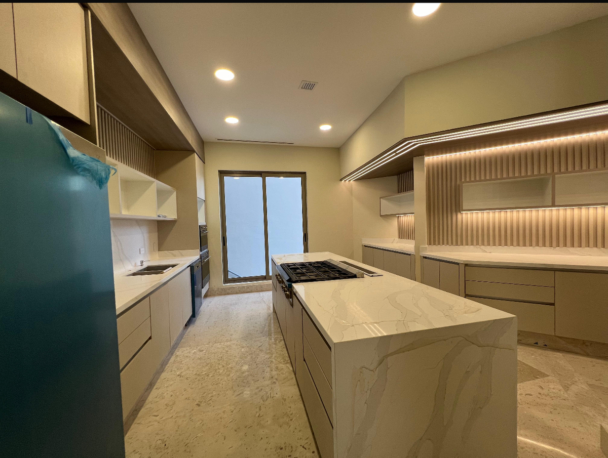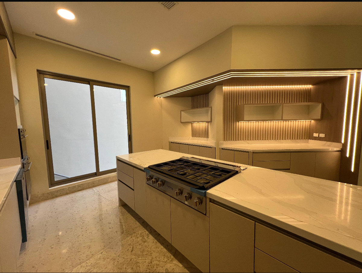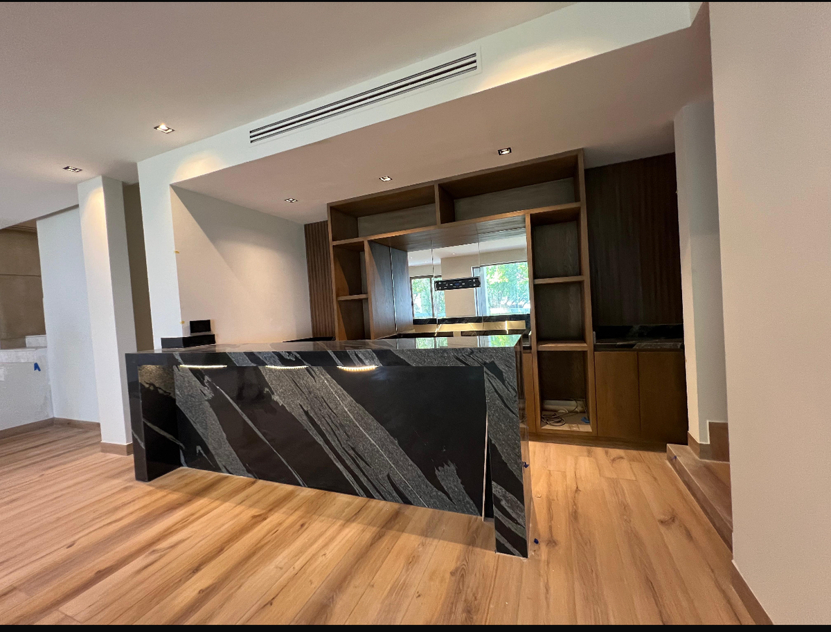 El área social es amplia e incluye un recibidor, sala, comedor y un área de bar. La cocina está completamente equipada y cuenta con un espacio de antecomedor con balcón. La cochera tiene capacidad para 3 autos, y toda la casa presenta finos acabados que realzan su elegancia.