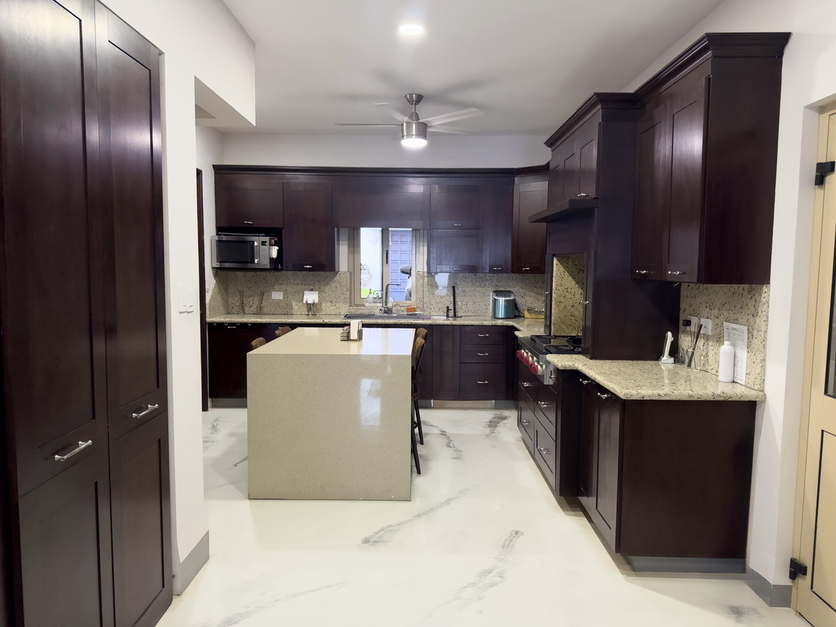 - Cocina con isla central, cubierta y backsplash de granito, gabinetes de madera de alta calidad, equipada con electrodomésticos de lujo