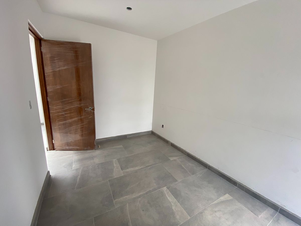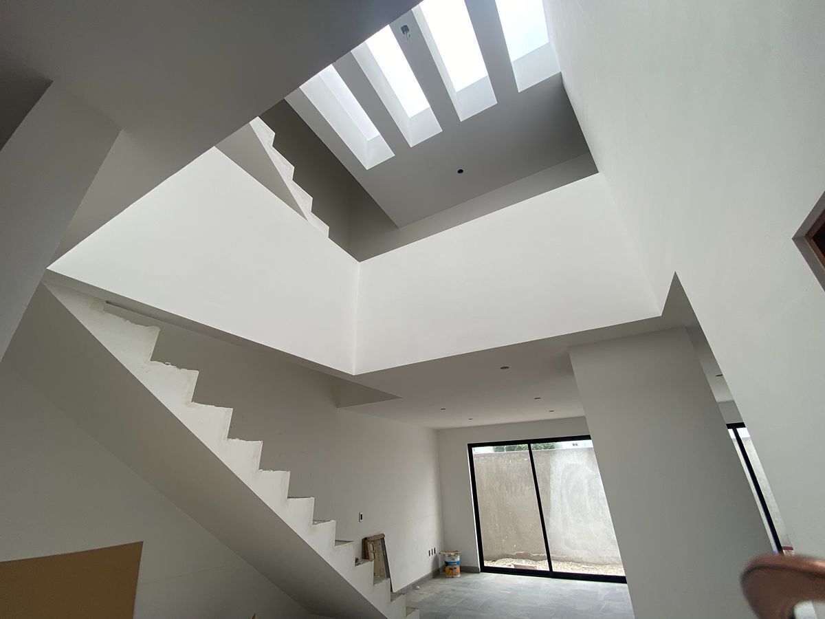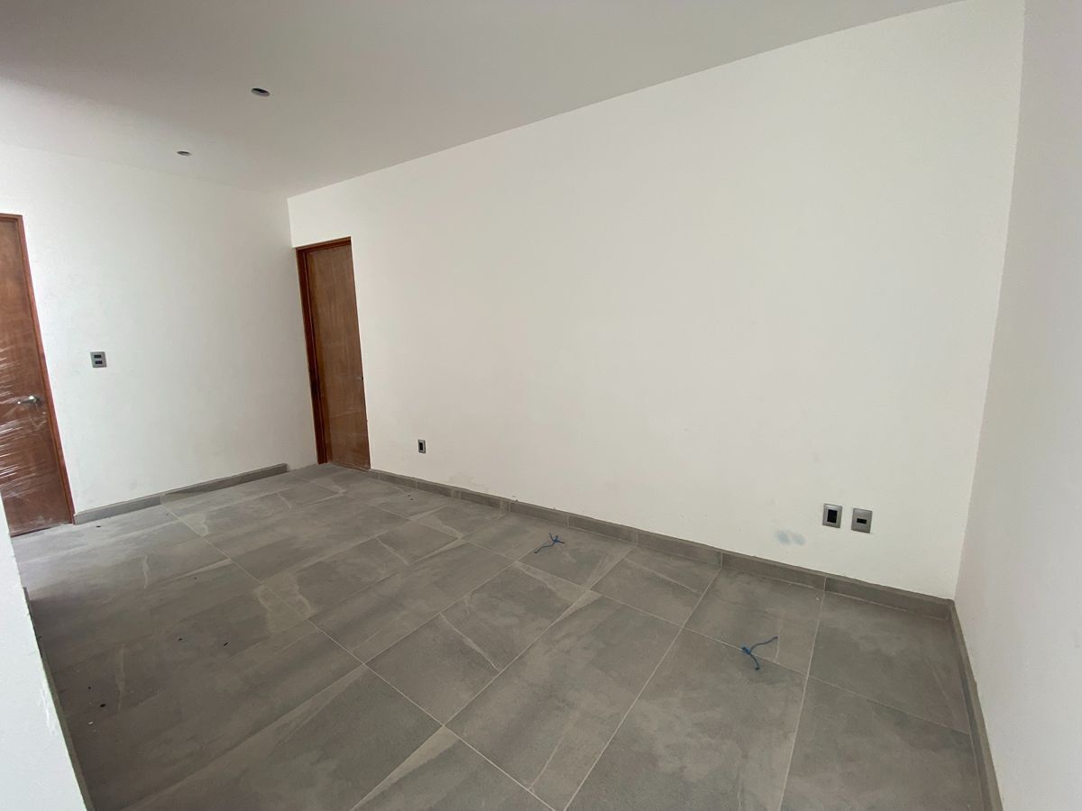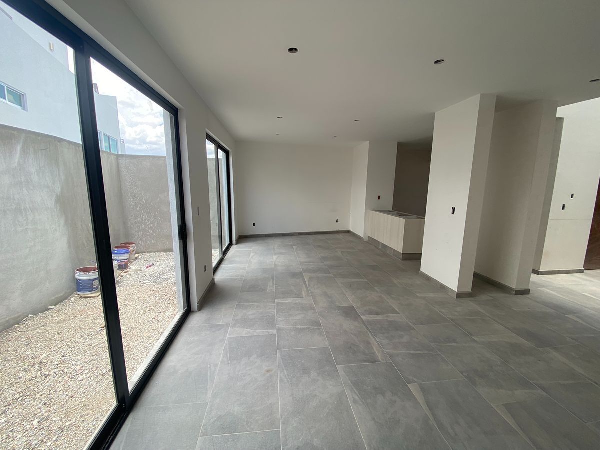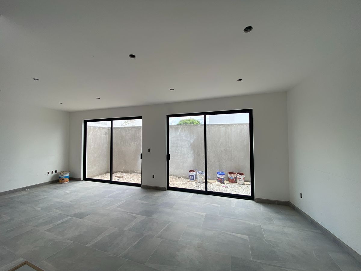 Cochera semi techada para dos autos, medio baño, estudio, recibidor a doble altura, estancia sala-comedor, cocina integral con cuarto de lavado y jardín.