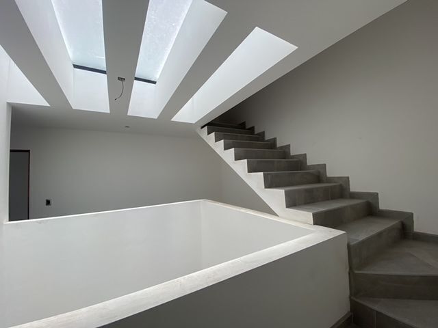 Semi-covered garage for two cars, half bathroom, study, double-height entrance hall, living-dining room, integral kitchen with laundry room and garden.