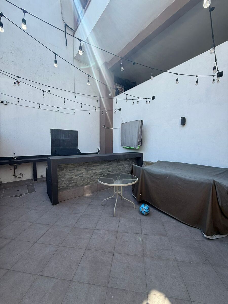 Sótano: Medio baño, bar con tarja y barra y sala de TV, con salida al patio que cuenta con asador y barra.