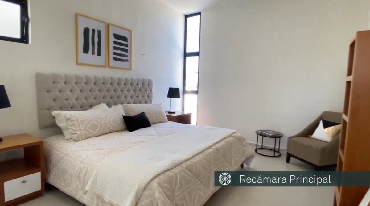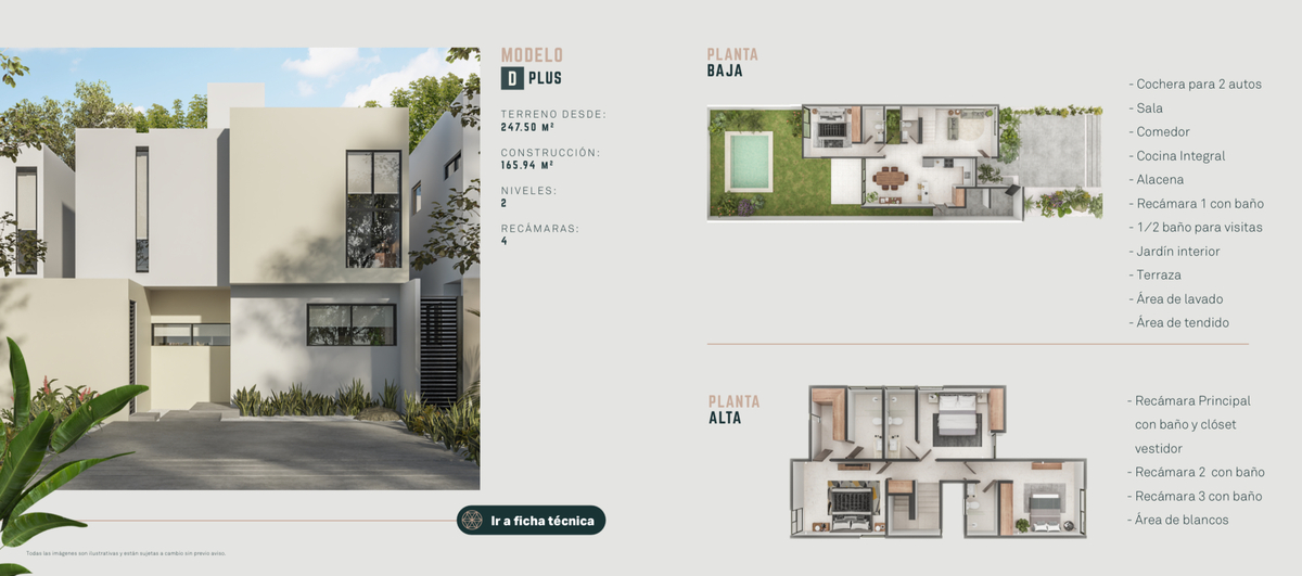 • Planta alta: recámara principal con clóset vestidor y baño, dos recámaras secundarias con baño propio, área de blancos.