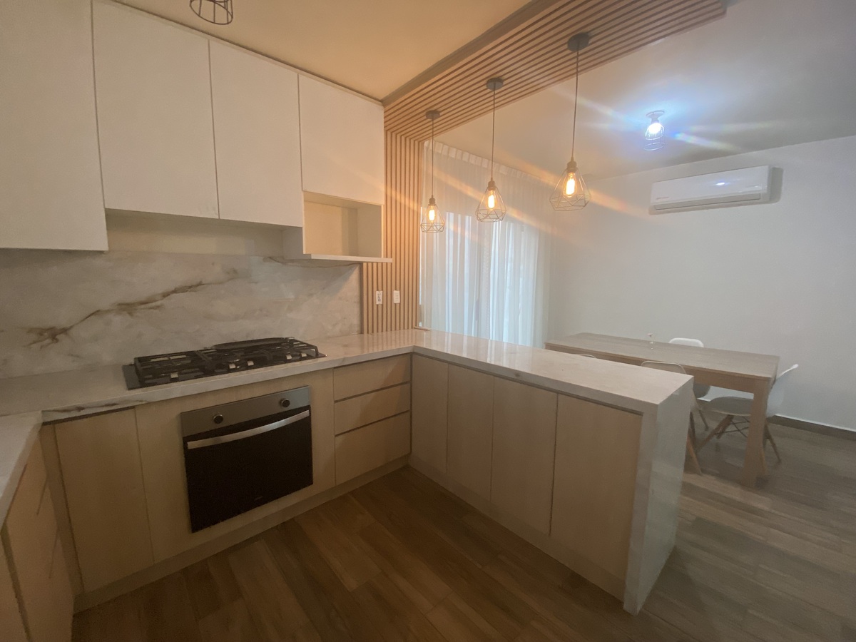 COCINA INTEGRAL CON BARRA DESAYUNADORA Y CUBIERTA DE PIEDRA TECNOLOGICA, EQUIPADA CON ESTUFA , HORNO Y TARJA