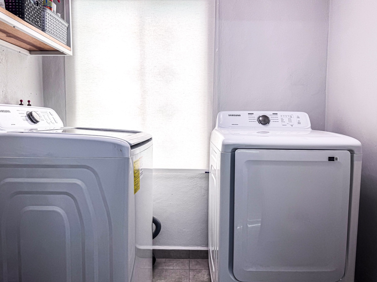 La casa cuenta con una espaciosa cocina estilo galera con abundante espacio de encimera y elegantes encimeras de mármol, perfecta tanto para cocinar a diario como para recibir invitados. El lavadero incluye una lavadora y secadora de gran tamaño para mayor comodidad. La propiedad está equipada con un sistema de presión de agua doméstico, que garantiza un flujo de agua constante y constante en toda la casa.