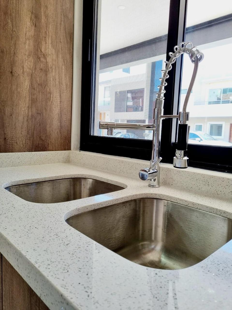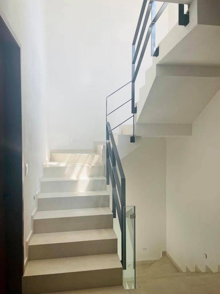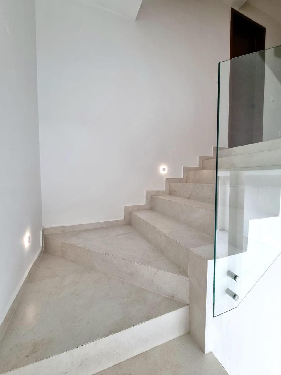 On the first level, it has a garage for two cars with a garden, an office with the option for a fourth bedroom, a full bathroom, a spacious living-dining room, a beautiful equipped kitchen with a stainless steel grill, tempered glass hood, quartz-covered oven tower, and island, an interior patio with a nice garden.