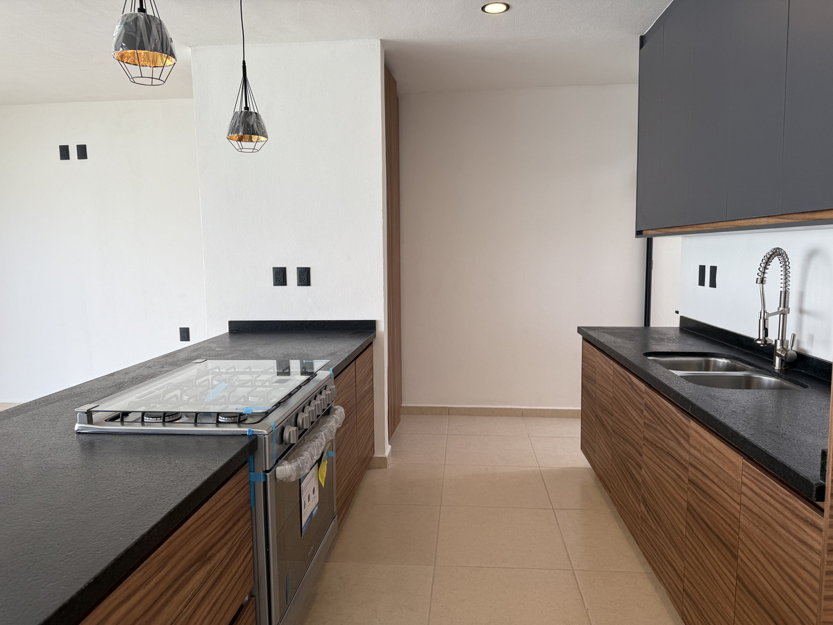 Cocina equipada con cubierta de granito San Gabriel en acabado cepillado / Alacena