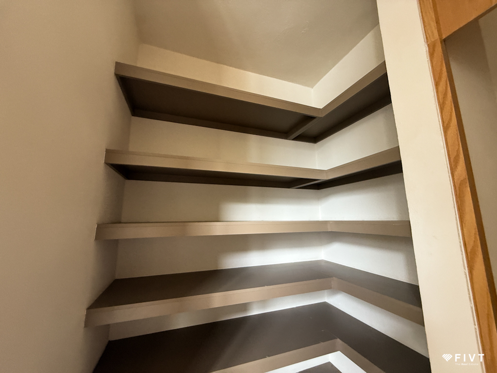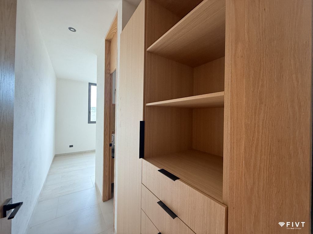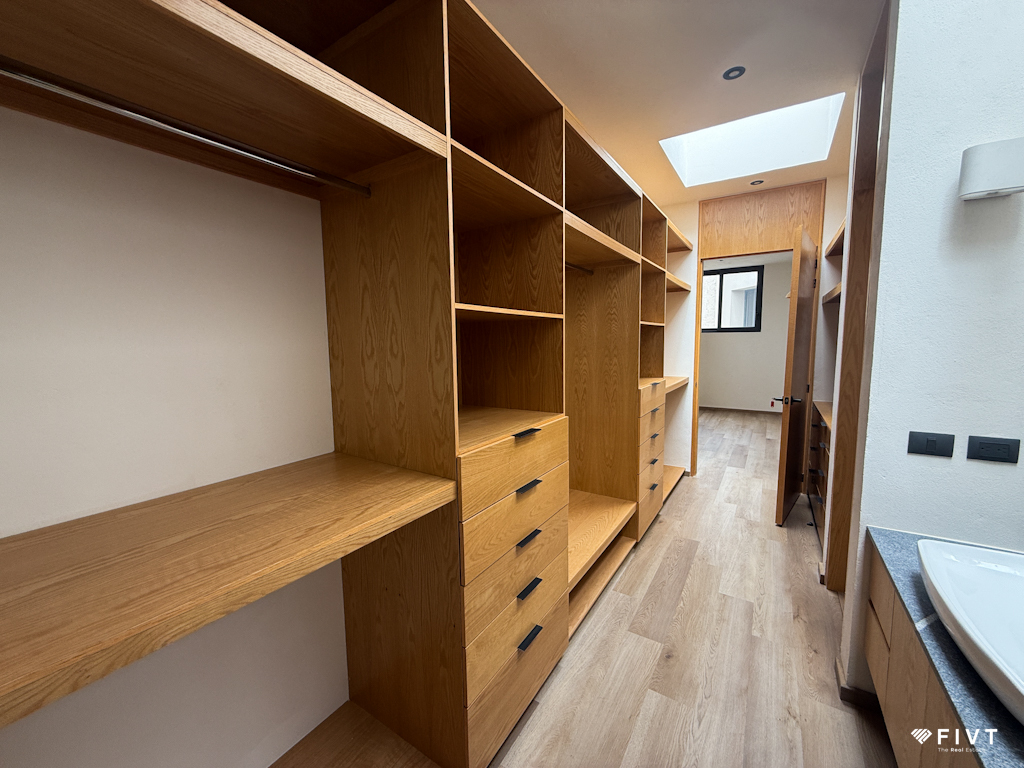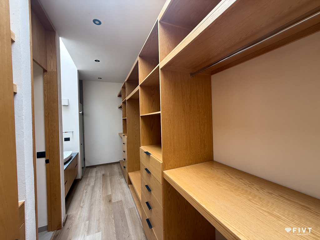 Carpintería enchapada en encino y pisos de porcelanato de alta calidad.