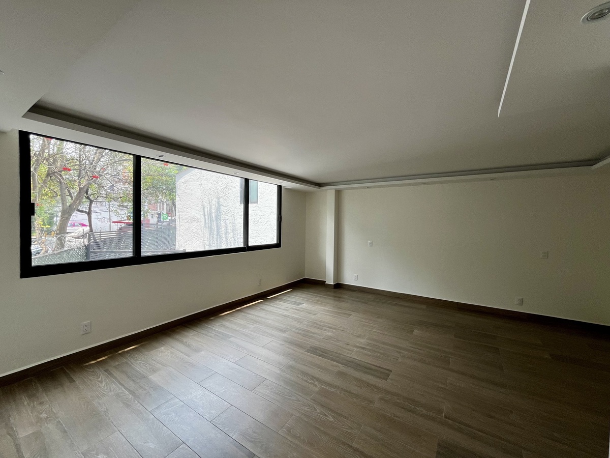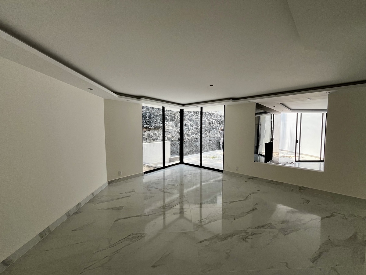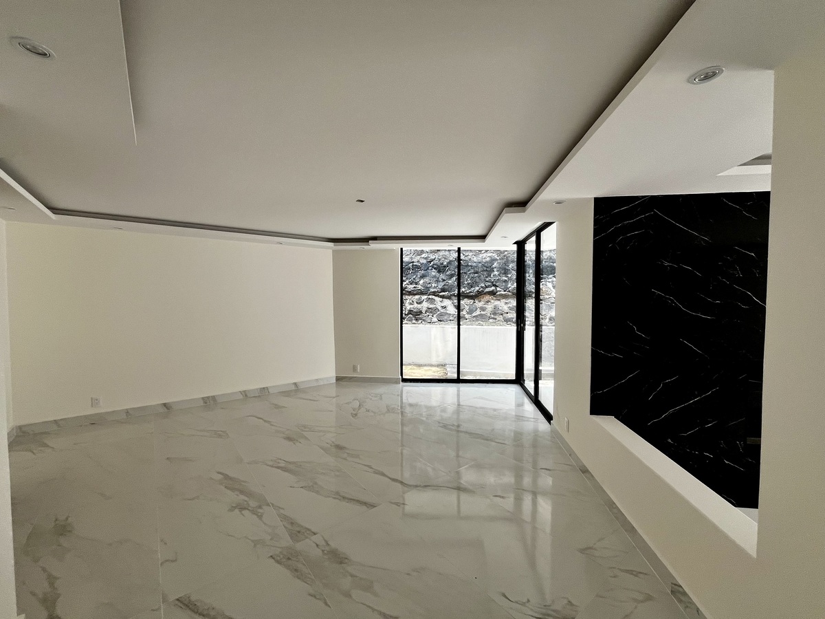 En planta baja encontramos un recibidor con techos a doble altura, sala y comedor con chimenea de etanol y salida a la terraza, cava y baño de visitas.