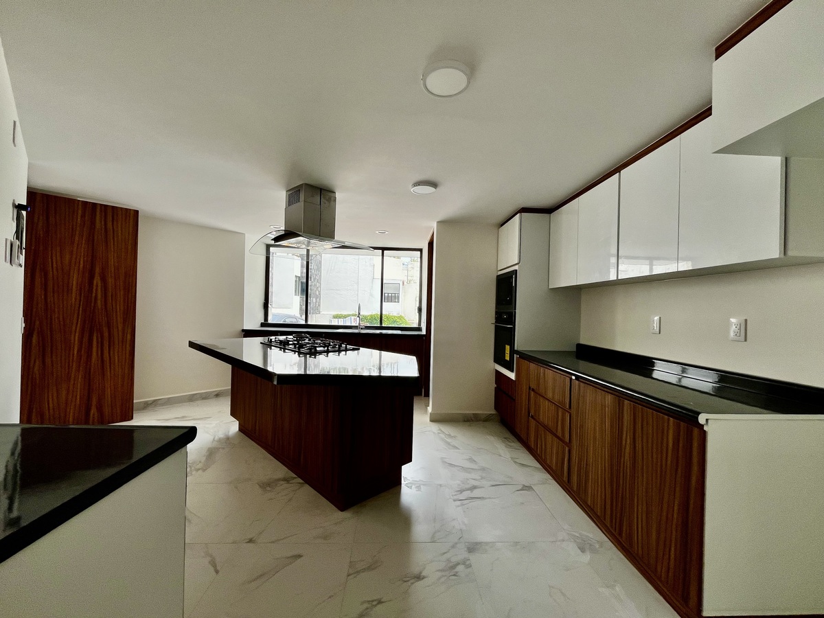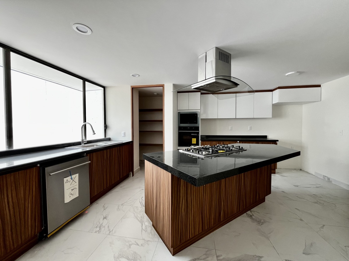 Cocina equipada con isla con parrilla, campana, horno eléctrico, horno de microondas, lavavajillas y tarja marca Teka y alacena.
