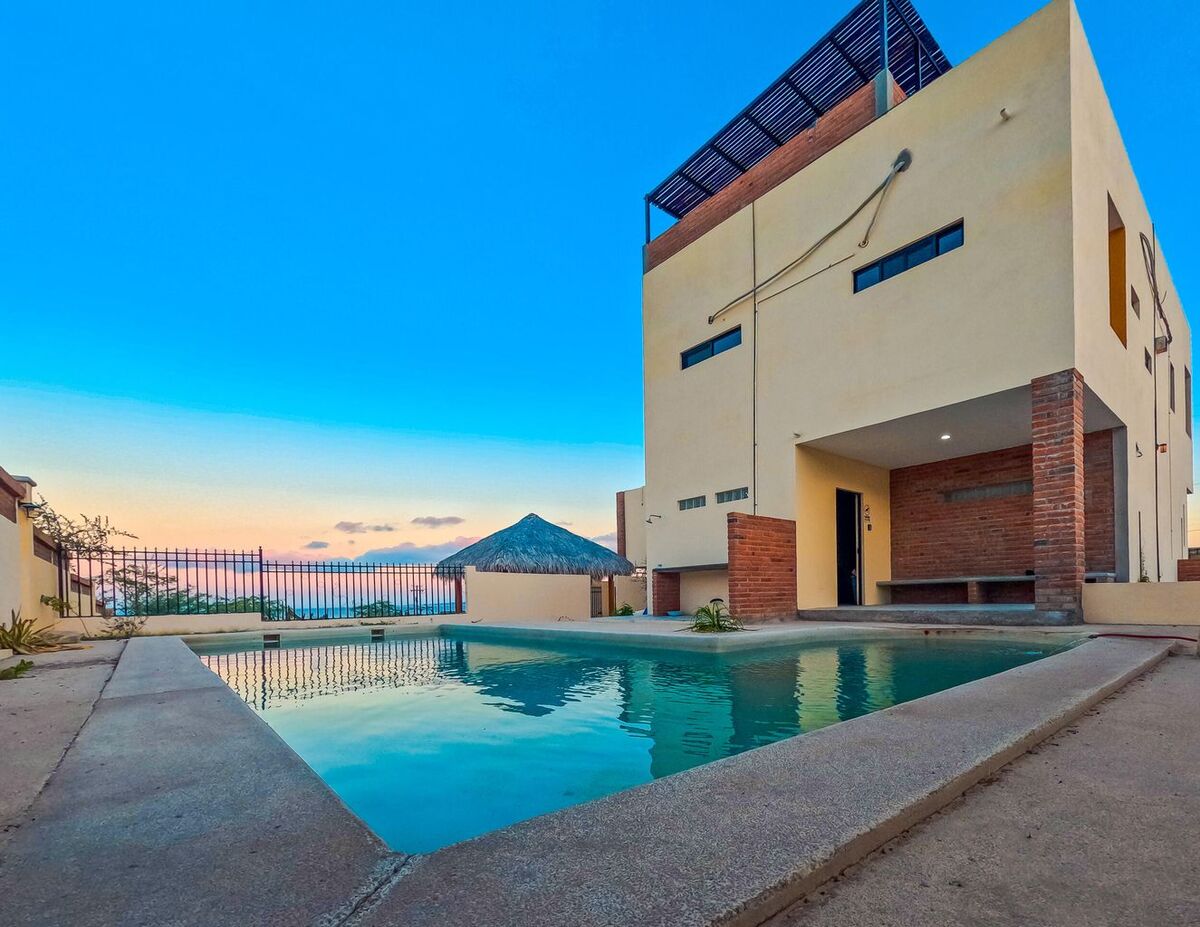 Casa de dos plantas con diseño multinivel y terraza con vistas en la tercera planta con estructura de aluminio para dar sombra. 2 dormitorios, 1 baño con aire acondicionado, gran piscina y patio con ducha exterior, todo con agua corriente. La casa tiene vistas al mar desde la terraza delantera de la segunda planta y desde las puertas correderas de cristal del salón. La azotea de la tercera planta cuenta con una zona de estar con vistas de 360 grados y barbacoa de leña. Garaje para dos coches, además de un trastero debajo de las escaleras con mucho espacio. Entrada pavimentada en una propiedad totalmente vallada y cerrada que incluye una puerta de acceso a la zona de la piscina para los huéspedes que llegan desde el aparcamiento exterior. Gran privacidad y seguridad para mascotas o inquilinos. Excelente historial de alquiler. La entrada automática con puerta en la zona de aparcamiento privado crea un acceso tranquilo y fácil. A solo unas manzanas de la playa de Palmas.