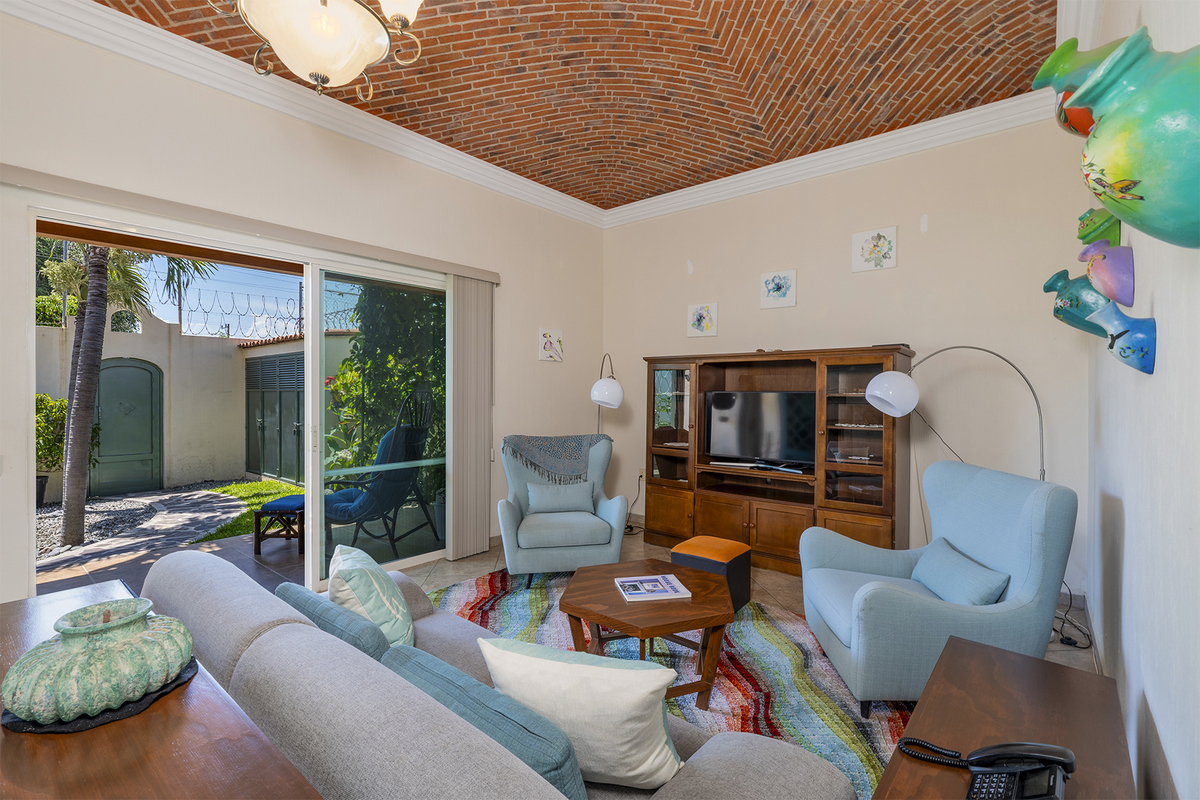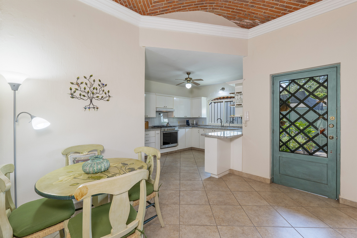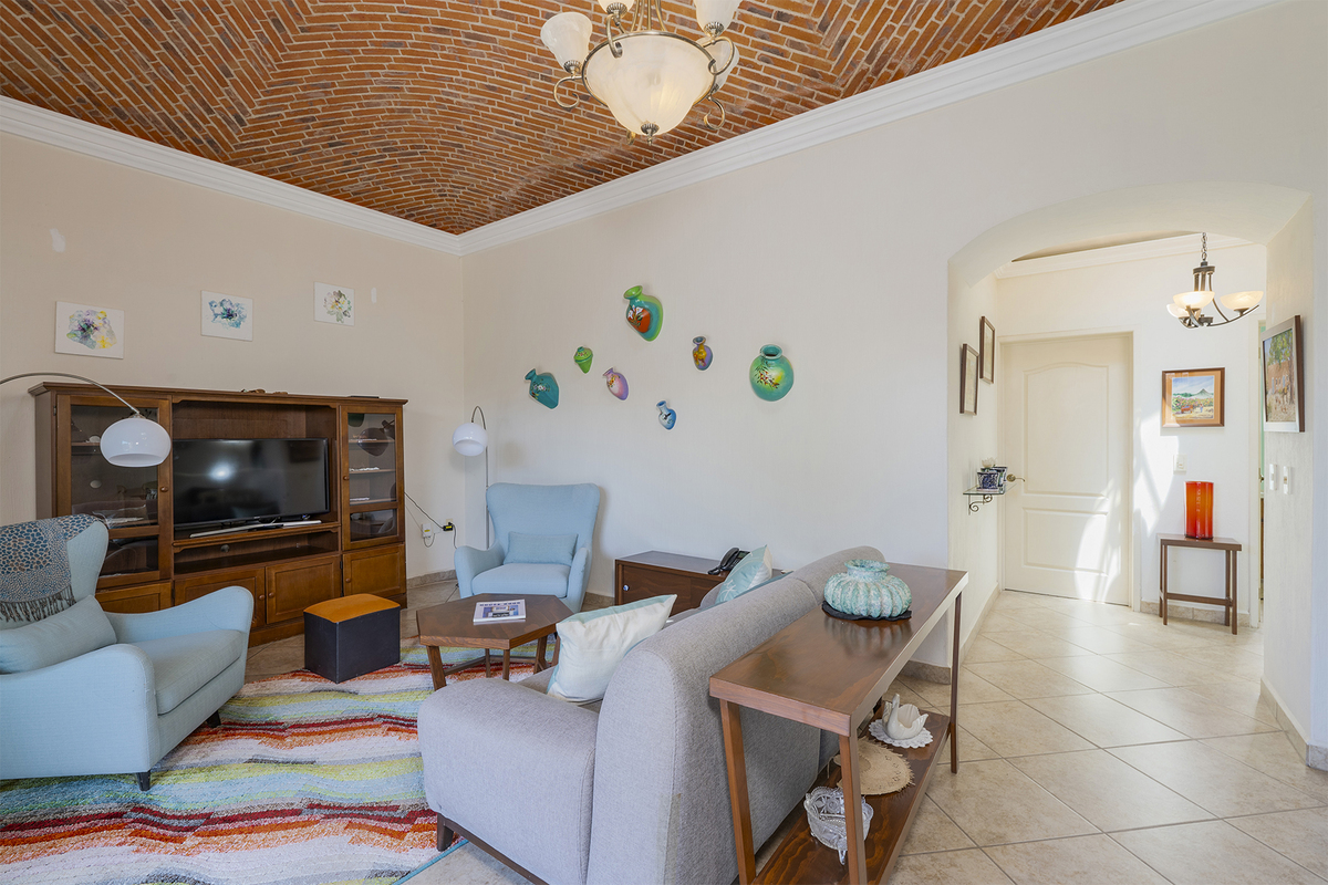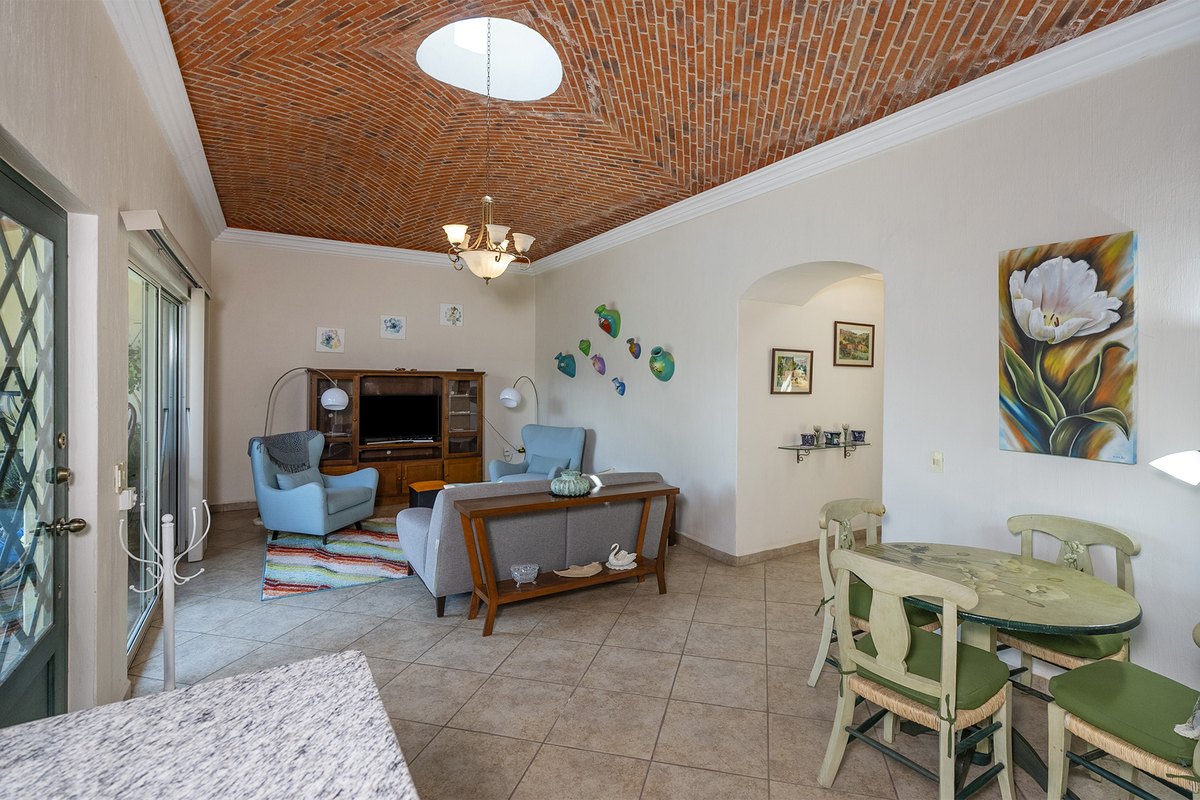 La sala-comedor de concepto abierto luce una hermosa cúpula de ladrillo, la cocina equipada incluye electrodomésticos de primera y junto a ella se encuentra la lavandería. Además, tiene un coqueto jardín frontal, portón automático para estacionamiento privado y sistemas de filtración y purificación de agua.