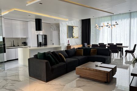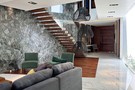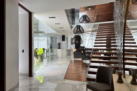 Spectacular entrance with a beautiful water mirror, wonderful double height, and a grand interior garden.