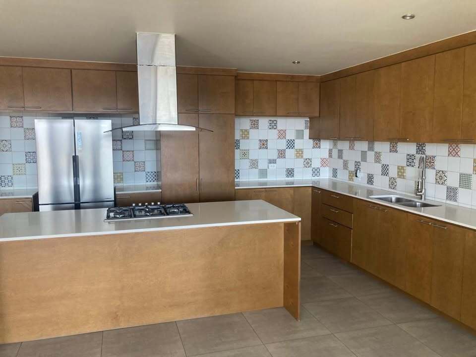 Cocina amplia y equipada con isla y parrilla de 5 hornillas, horno independiente y campana extractora.
