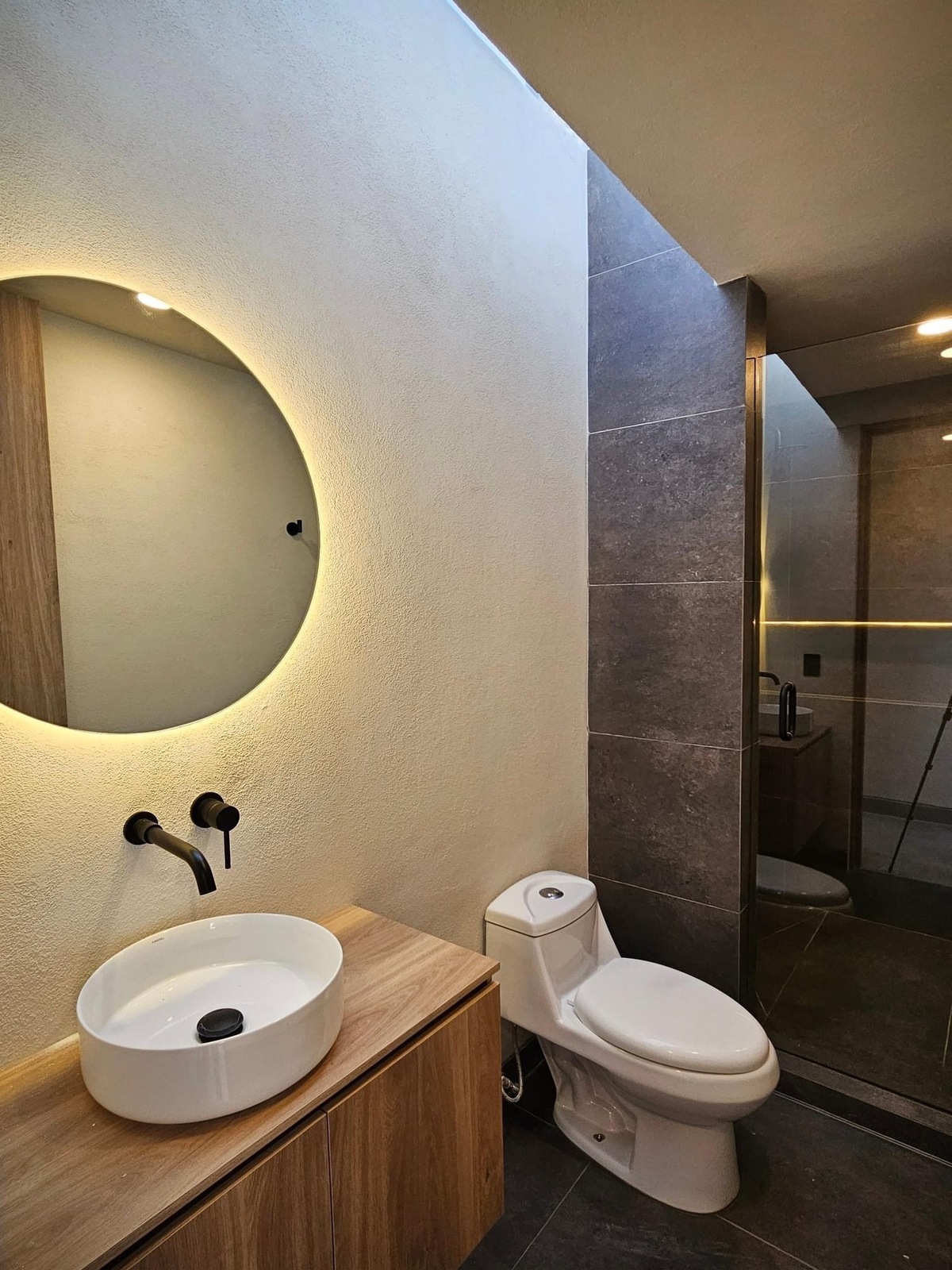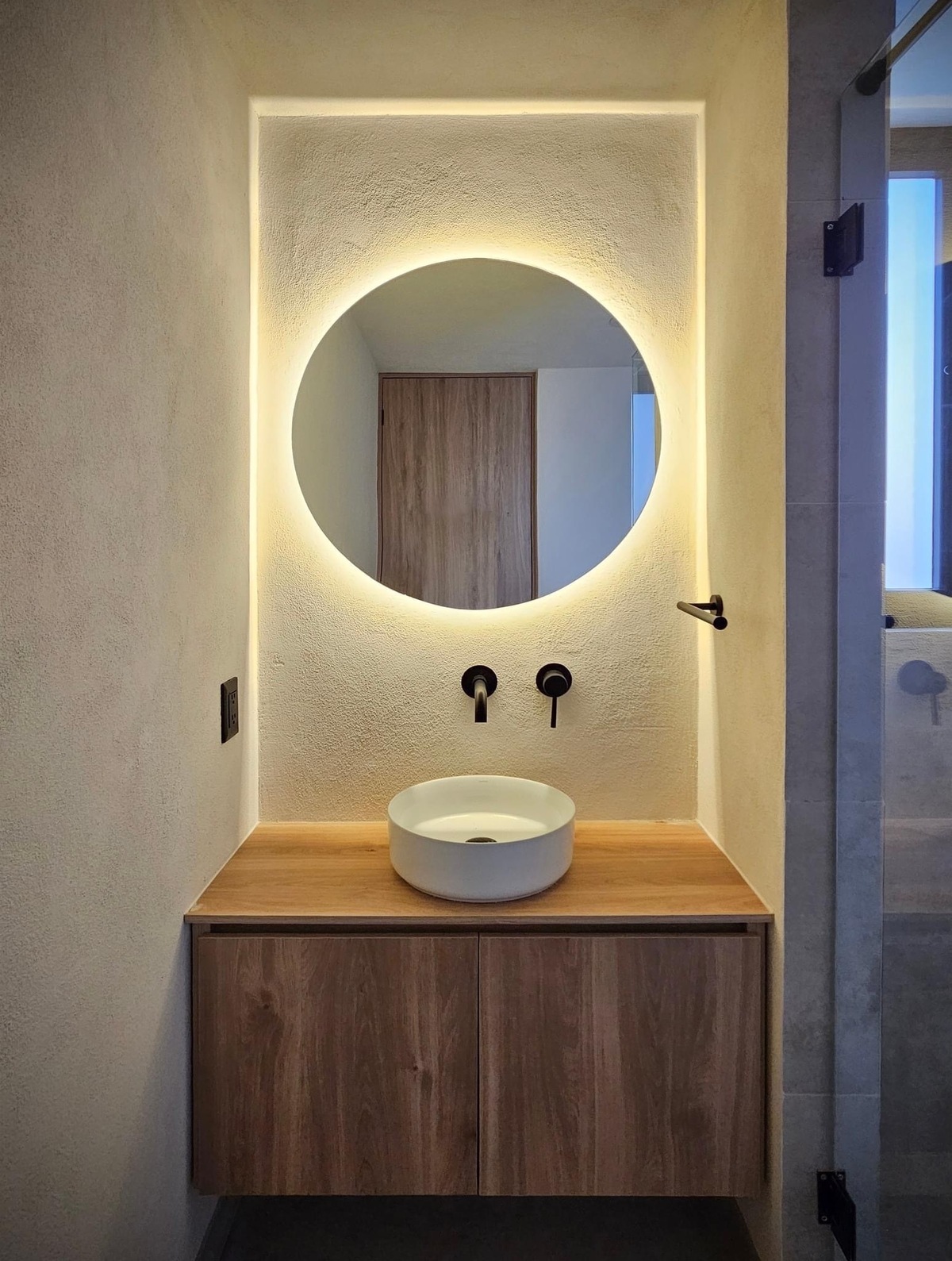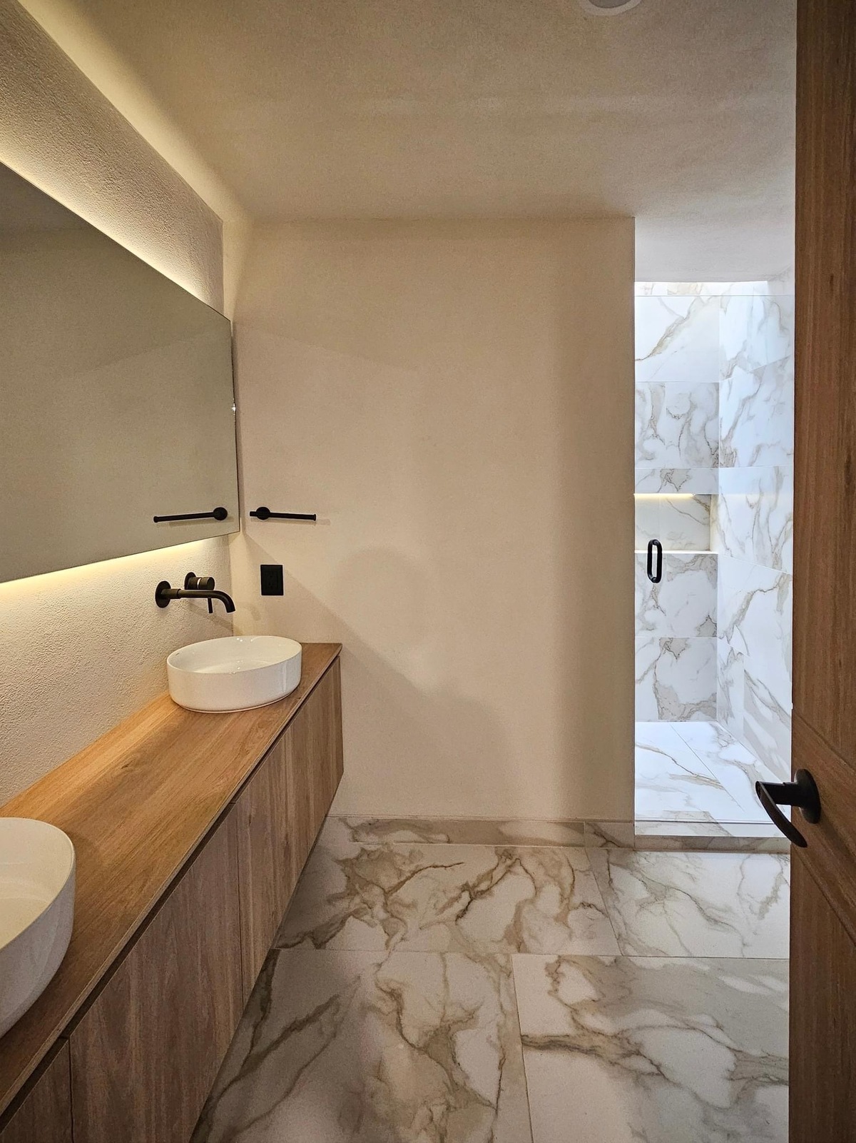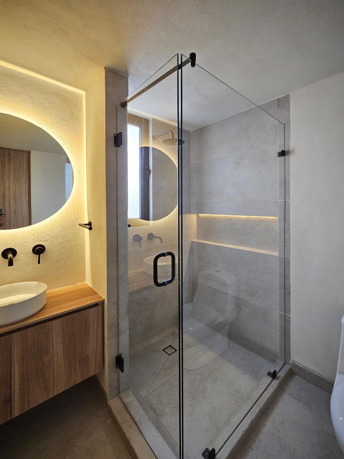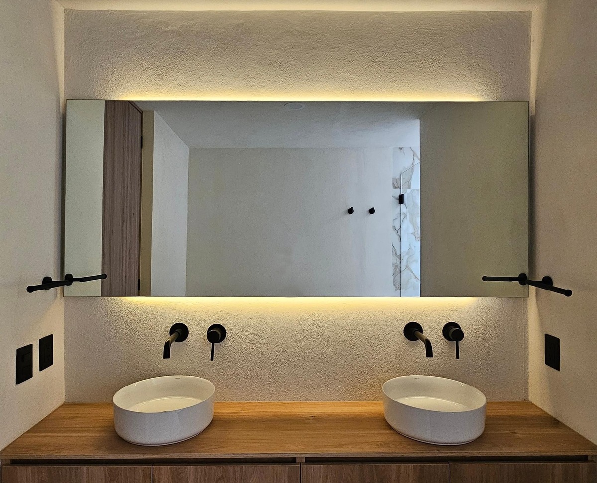 • Baños con canceles de cristal templado y espejos con iluminación indirecta