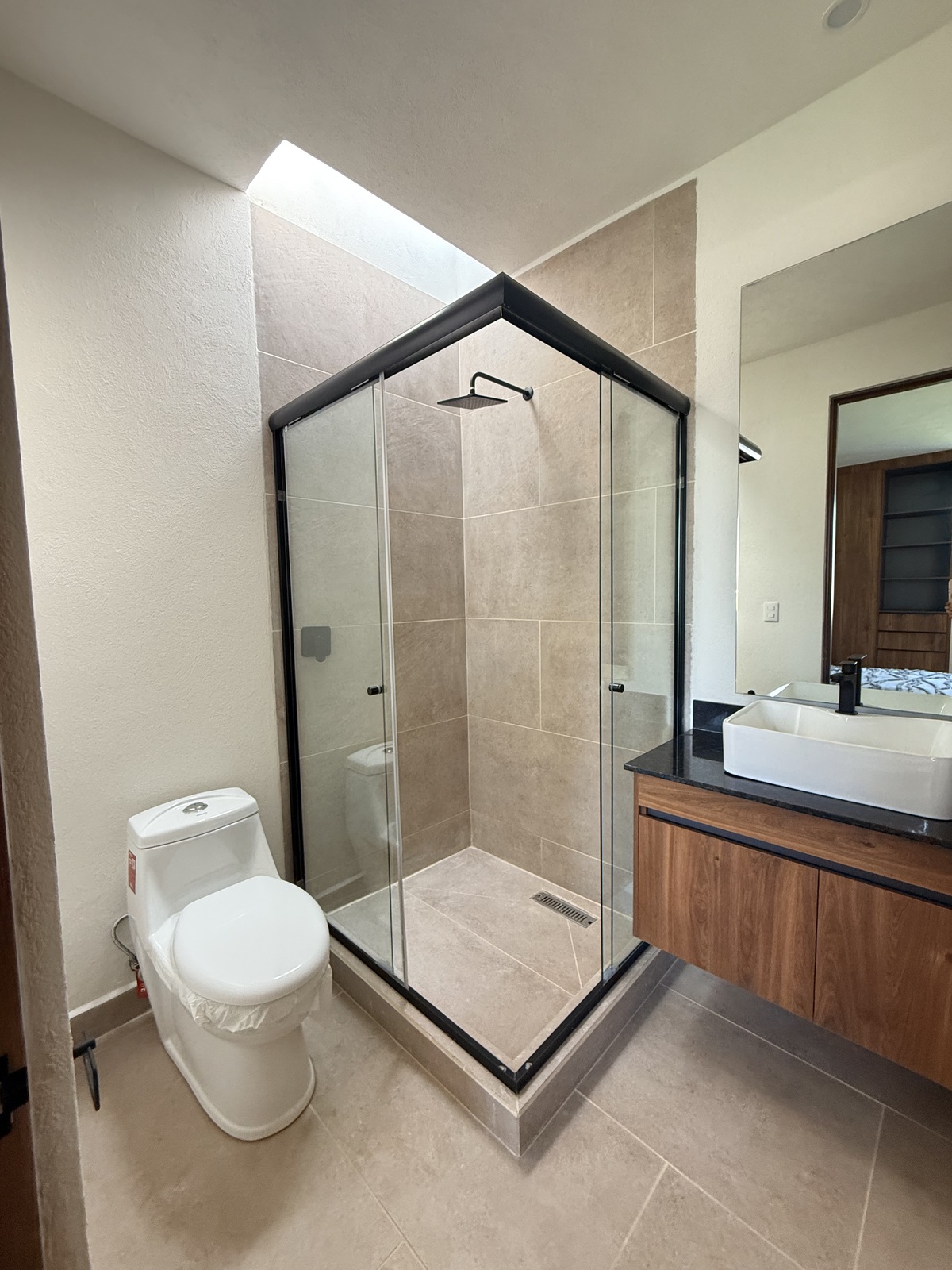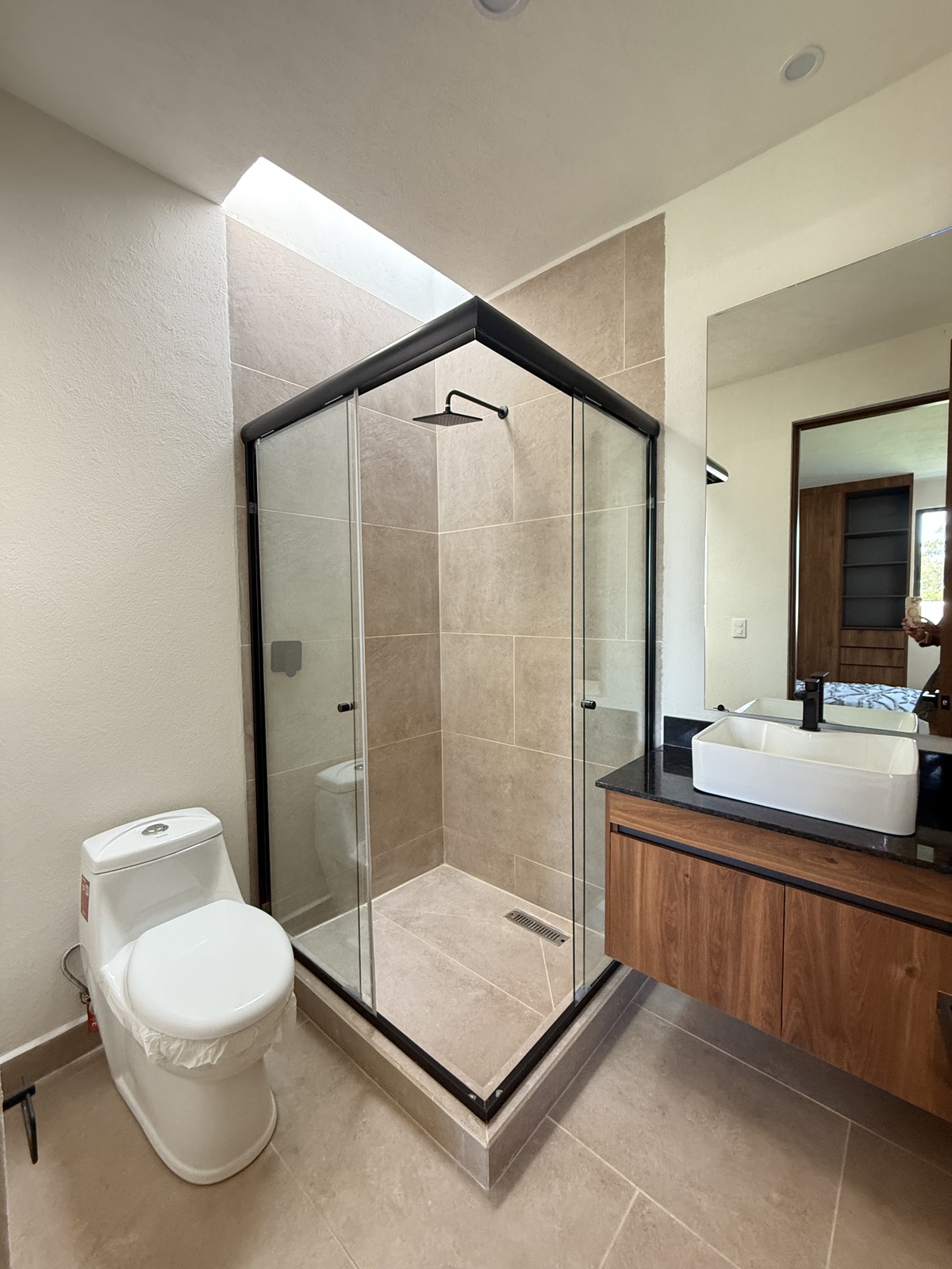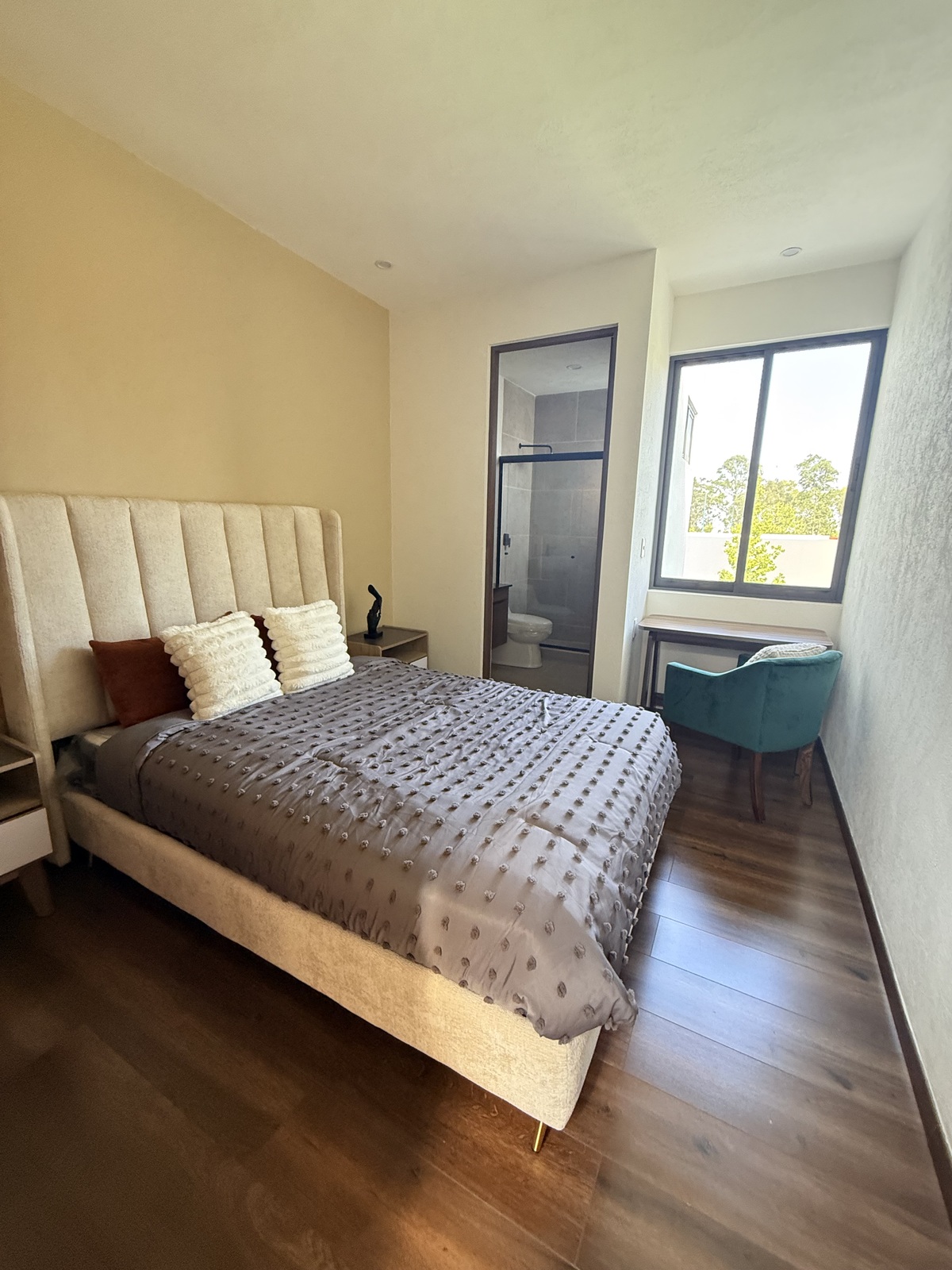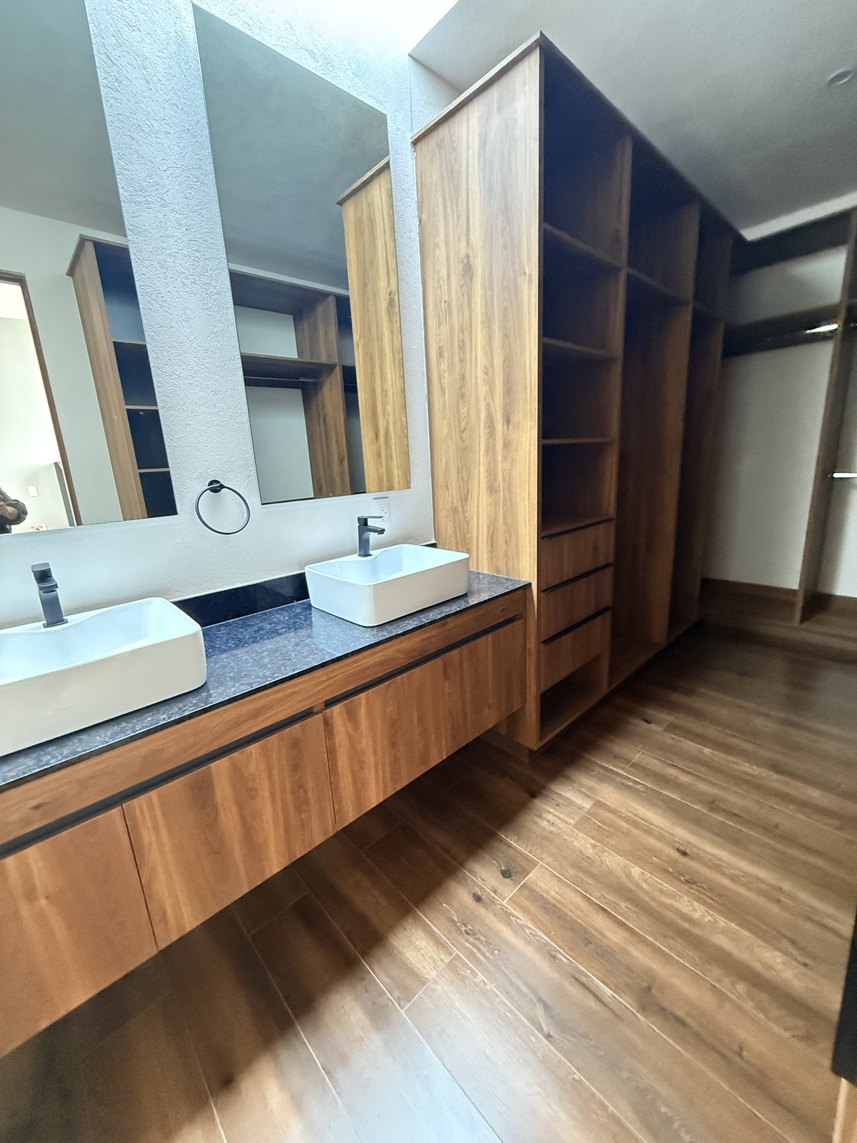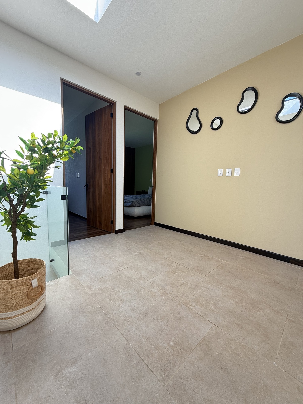 En la planta alta, la casa cuenta con tres recámaras, todas con baño completo privado, lo que garantiza privacidad y confort en cada espacio. La recámara principal dispone además de un vestidor y un elegante baño con doble lavabo, mientras que las secundarias cuentan con clósets amplios y excelente iluminación. Complementa esta área una sala de TV o espacio familiar que brinda calidez y funcionalidad.